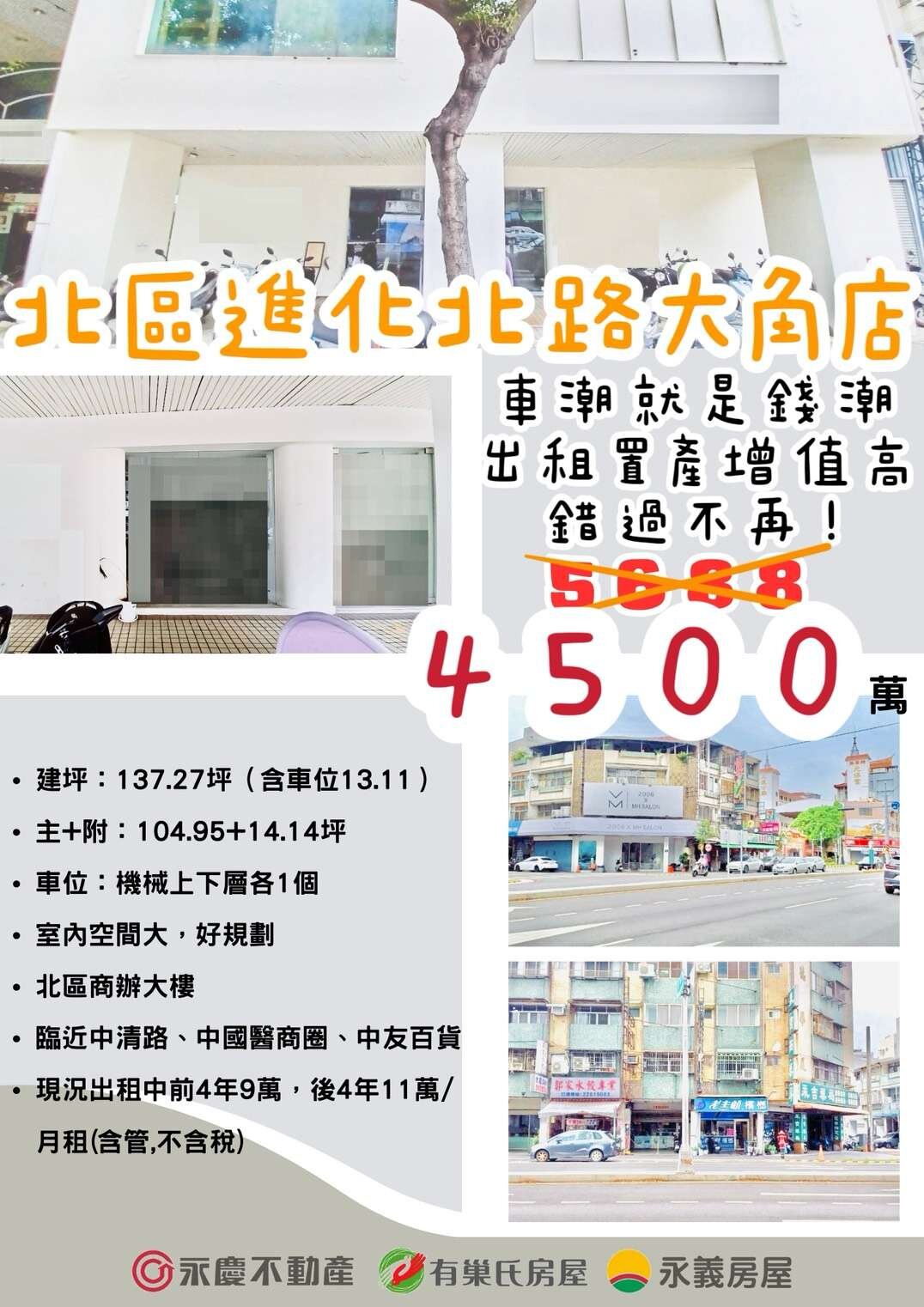 北區進化北路大角店車潮就是錢潮出租置產增值高