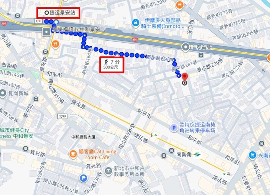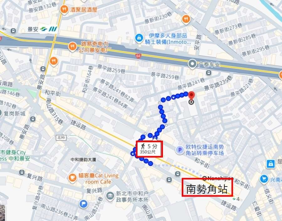 距捷運南勢角站約350公尺,走路約5分鐘 (這是橘線新蘆線)