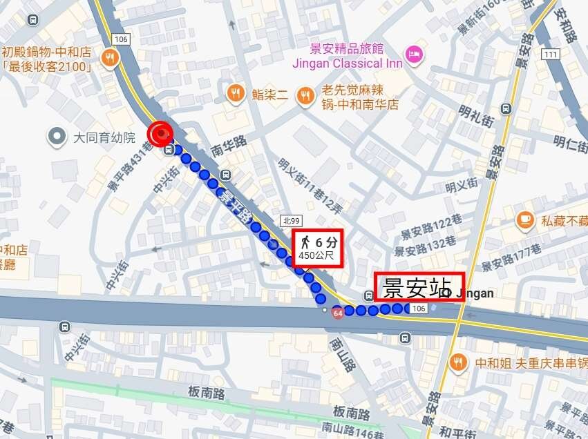 距捷運景安站約450公尺,走路約6分鐘就到,沿路都很熱鬧很明亮很安全