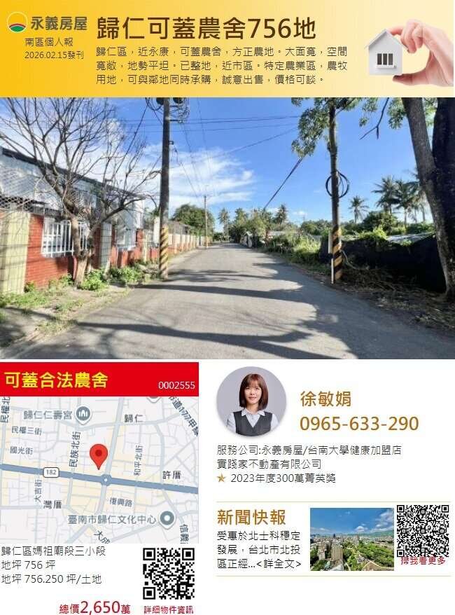 【永義敏娟】歸仁近永康可蓋合法農舍756方正農地 1.歸仁區,近永康,可蓋農舍,方正農地。 2.大面寬,空間寬敞,好使用,地勢平坦。 3.已整地,近市區,交通國一、國三、86快速道路,南來北往好方便。 4.特定農業區,農牧用地,可與鄰地同時承購,誠意出售,價格可談。 ^^趕快一起來看地吧 !! 預約專線:徐小姐 0965-633-290 《手機號碼亦可加 Line 聯絡》 【以上資訊如有記載錯誤,依謄本登記為準】