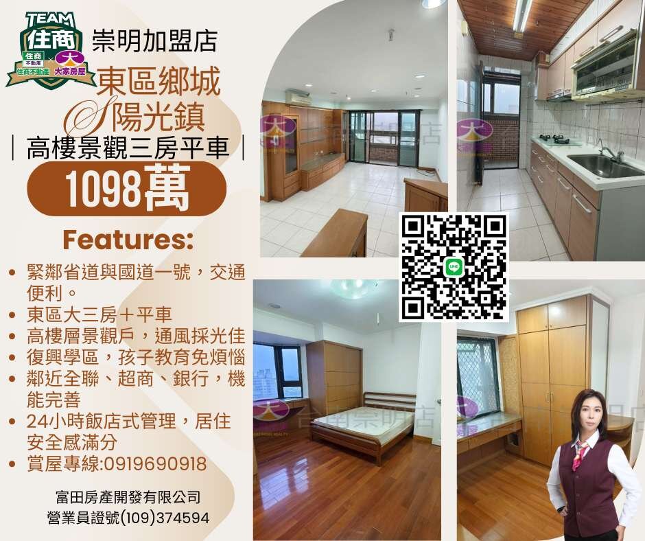 東區鄉城陽光鎮高樓層景觀三房平車