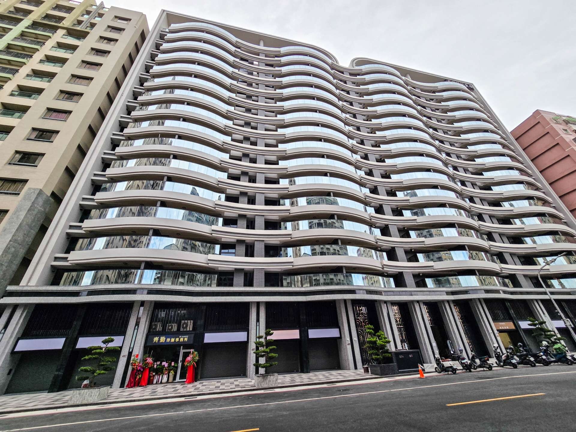 📍大樓外觀採律動的建築及浪型曲線,創造極具現代張力的建築美學,榮獲美國謬思設計大獎金獎,接待大廳、中庭花園、空中花園、交誼廳、會議室、健身房、親子遊戲區、兒童遊戲區、KTV、瑜珈教室、信箱區、曬被區,結構採RC鋼筋混凝土,建材有廚具:德匠、林內,衛浴:TOTO,LOW-E玻璃
