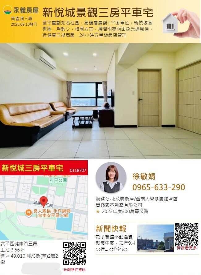【永義敏娟】安平新悅城香榭邊間景觀舒適三房平車宅