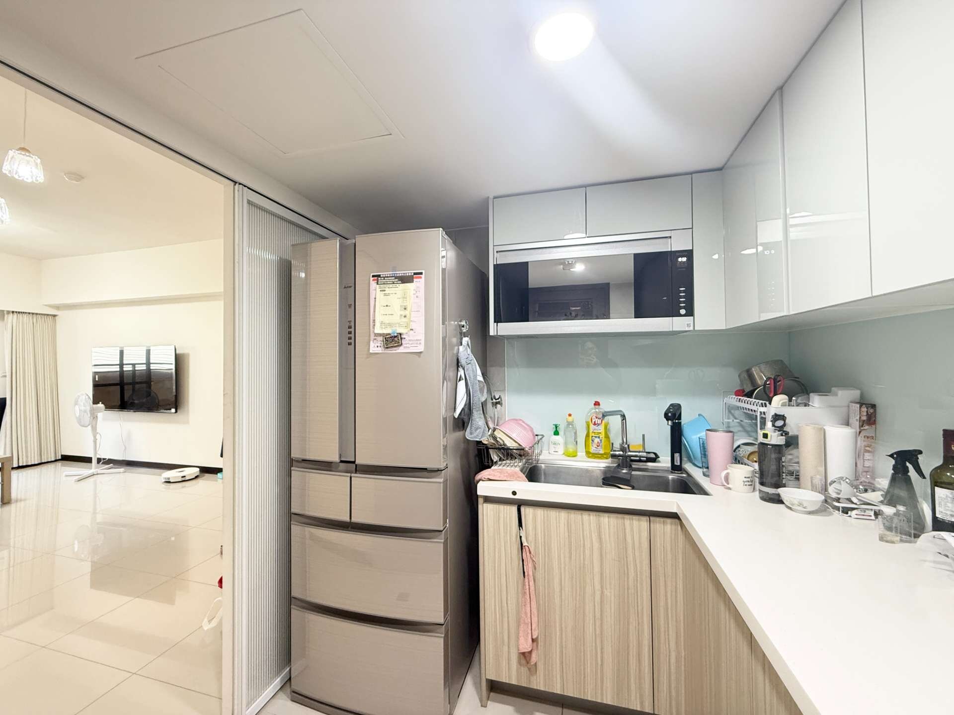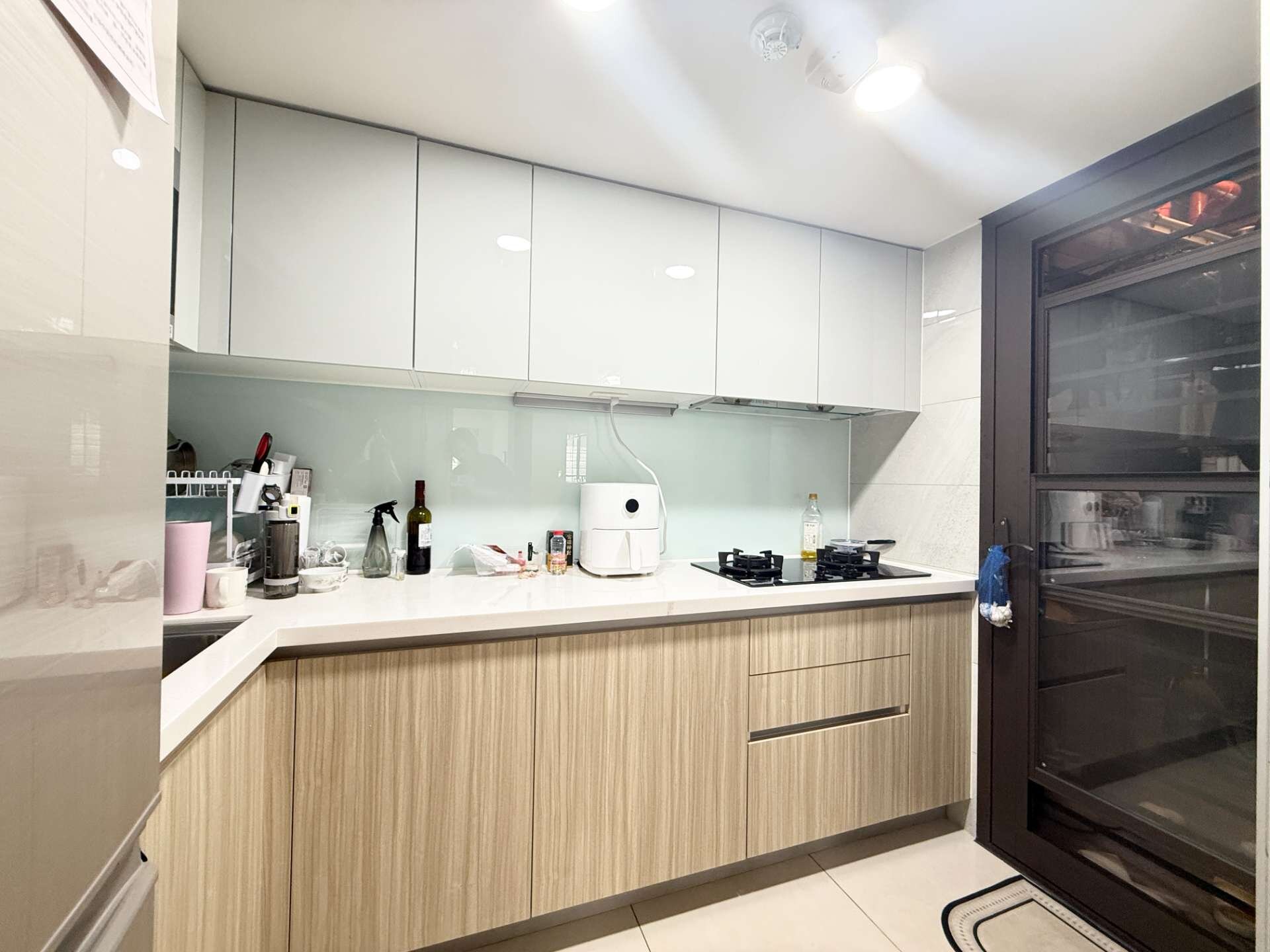 ★廚房為L型半開放式,現已裝設滑軌拉門,避免油煙逸散。後端連接工作陽台。