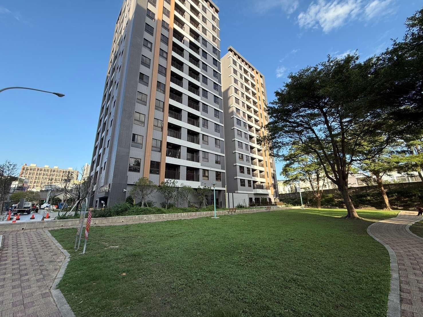 社區為兩棟,樓高13、14層,地下4層,共105戶,一層四戶共用2部電梯,公設比33.8%。