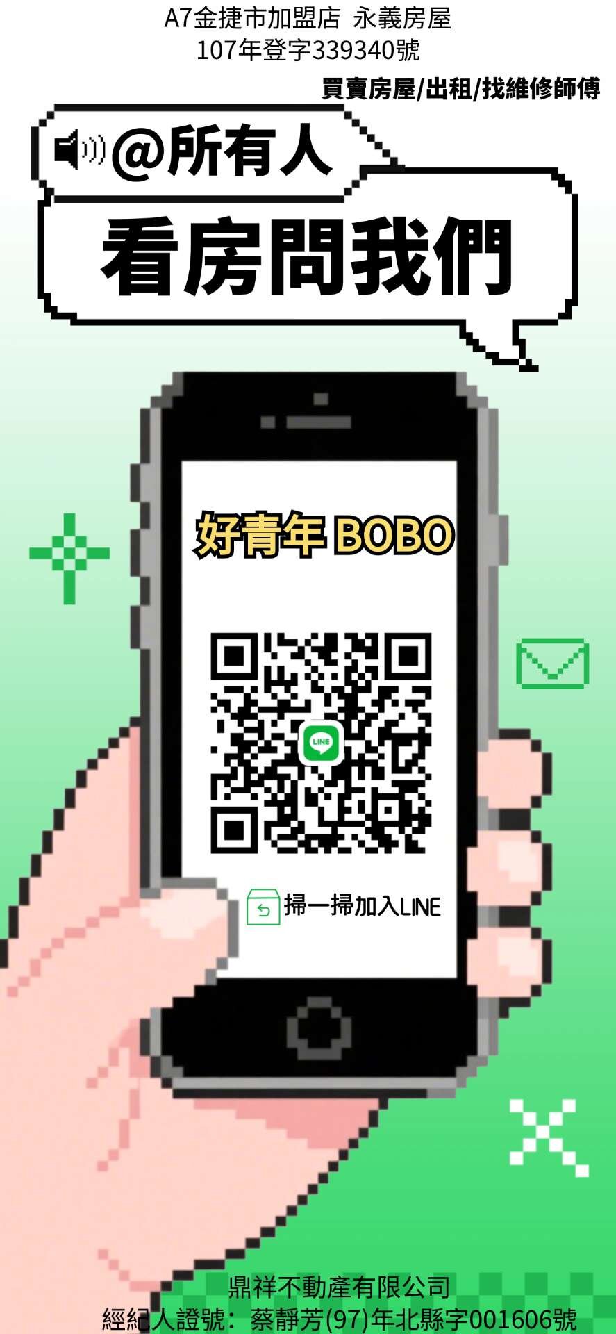買賣、租賃皆可以為您服務 ❶房間衛浴開窗 ❷前後陽台設計 ❸寬敞陽台好利用 ❹採光通風佳、格局好規劃 ❺衛浴乾溼分離 ❻全室溫馨裝潢、屋況佳、屋主用心維護 ❼24小時物業管理,包裹代收真方便 ❽公共空間整潔、垃圾集中處理 📞 歡迎預約賞屋 📱 許紋偵 0937-367-106 💬 LINE:bobo7986 永義A7金捷市加盟店|鼎祥不動產有限公司 經紀人證號:蔡靜芳(97)年北縣字001606號 107年登字339340號 許紋偵