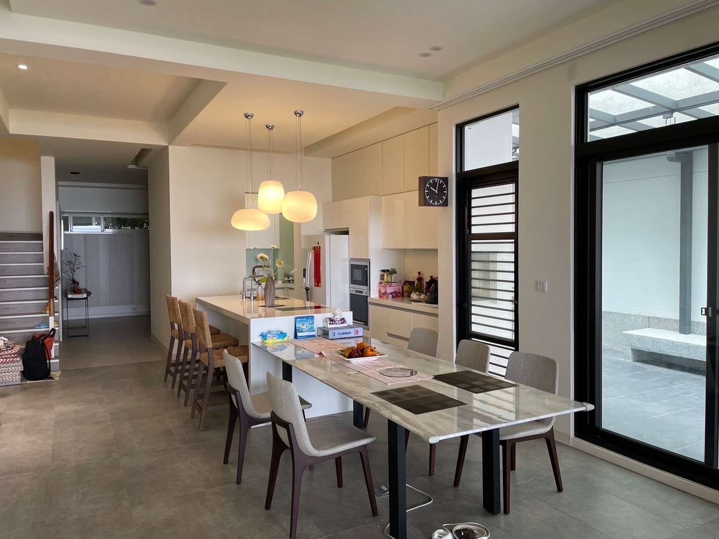 寬敞客廳秉持極簡設計,搭配舒適的沙發與家具,讓人感到放鬆自在。客廳與露臺相連,戶外美景自然延伸至室內空間。黃昏時分,夕陽光芒灑在露臺座椅與桌面上,讓這裡成為與家人朋友共享晚餐、欣賞美景的理想之地。