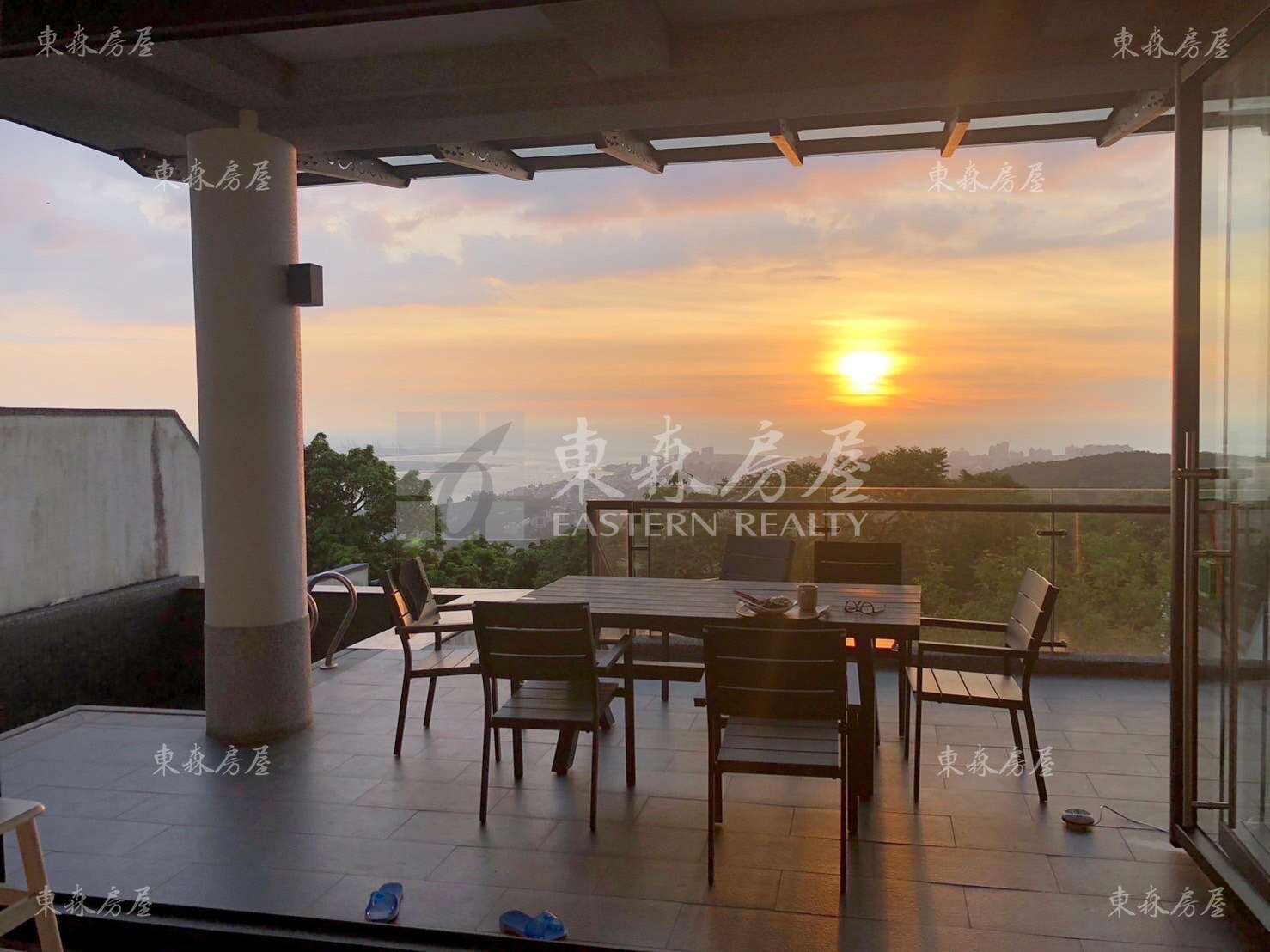 這處居所擁有壯麗的自然景觀,視野遼闊,青山與海岸線相互輝映,藍天白雲襯托遠方的建築,彷彿置身於自然懷抱中。傍晚時分,夕陽餘暉映染天邊,海天一色,露臺上陽光穿透座椅,光影交錯,營造溫暖平靜的氛圍,成為享受生活的理想場所。