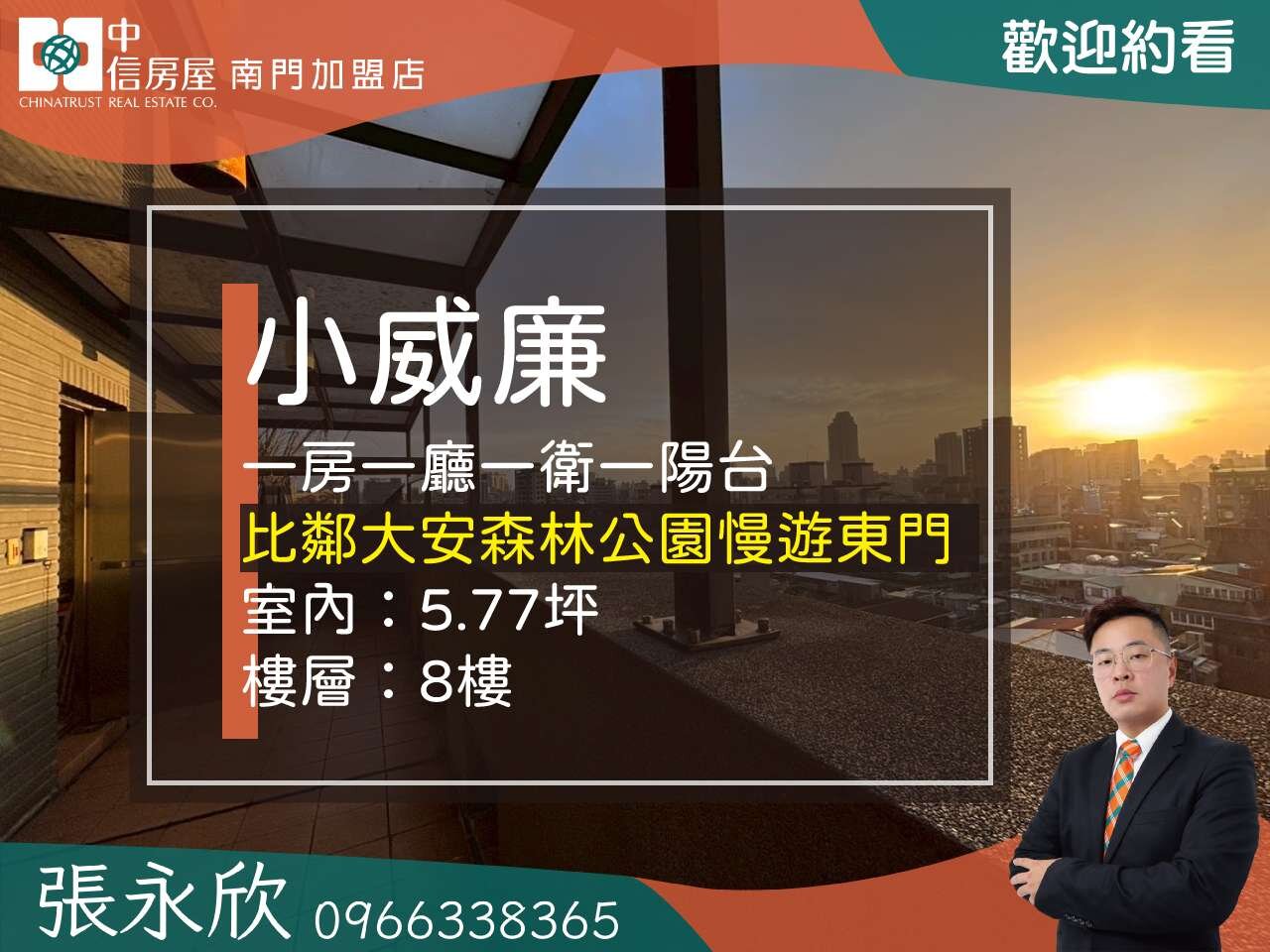 🏡物件:大安精華地段稀有電梯華廈,8樓高樓層視野採光佳。方正一房一廳一衛並配有獨立陽台,空間效益極大化,是單身貴族自住或置產收租的完美首選。