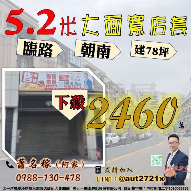 🏪 新光田臨路5.2米大面寬店套 ✨ 🛏️ 1店面+6套房 💰💰2460萬💰💰 ━━━━━━━━━━━━━━━━ 📏 面寬5.2米 💎 稀有大面寬店套釋出 🏪 1店面+6套房🛏️ 📍 正自強路 🛣️ 近向上路、交流道 🚗 南下北上超便利 📲 詳情請加入賴:@aut2721x 📞 蕭名稼(阿家) 0988-130-478 🏢 太平洋房屋沙鹿特三加盟店經紀人黃順國 🏛️ 勝元不動產經紀股份有限公司 📜 經紀業字號:中市地價二字1010026262 #不動產買賣 #向上路 #交流道 #新光田 #沙鹿 #梧棲 #龍井 #別墅 #透天 #店面 #廠房 #土地 #工業地 #農地 #建地 #蕭名稼 #中科 #幸福團隊 #金仲獎 #海線第一