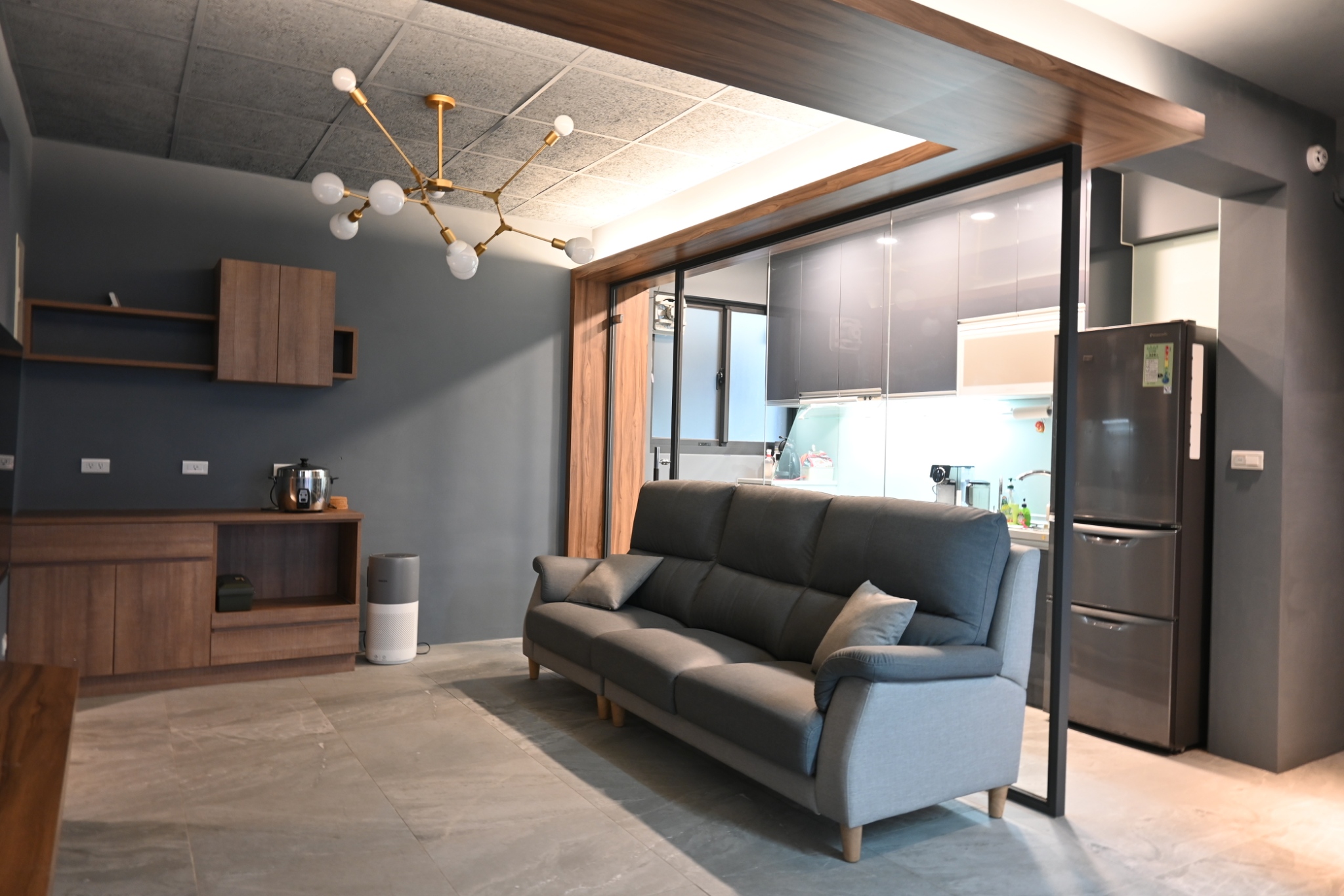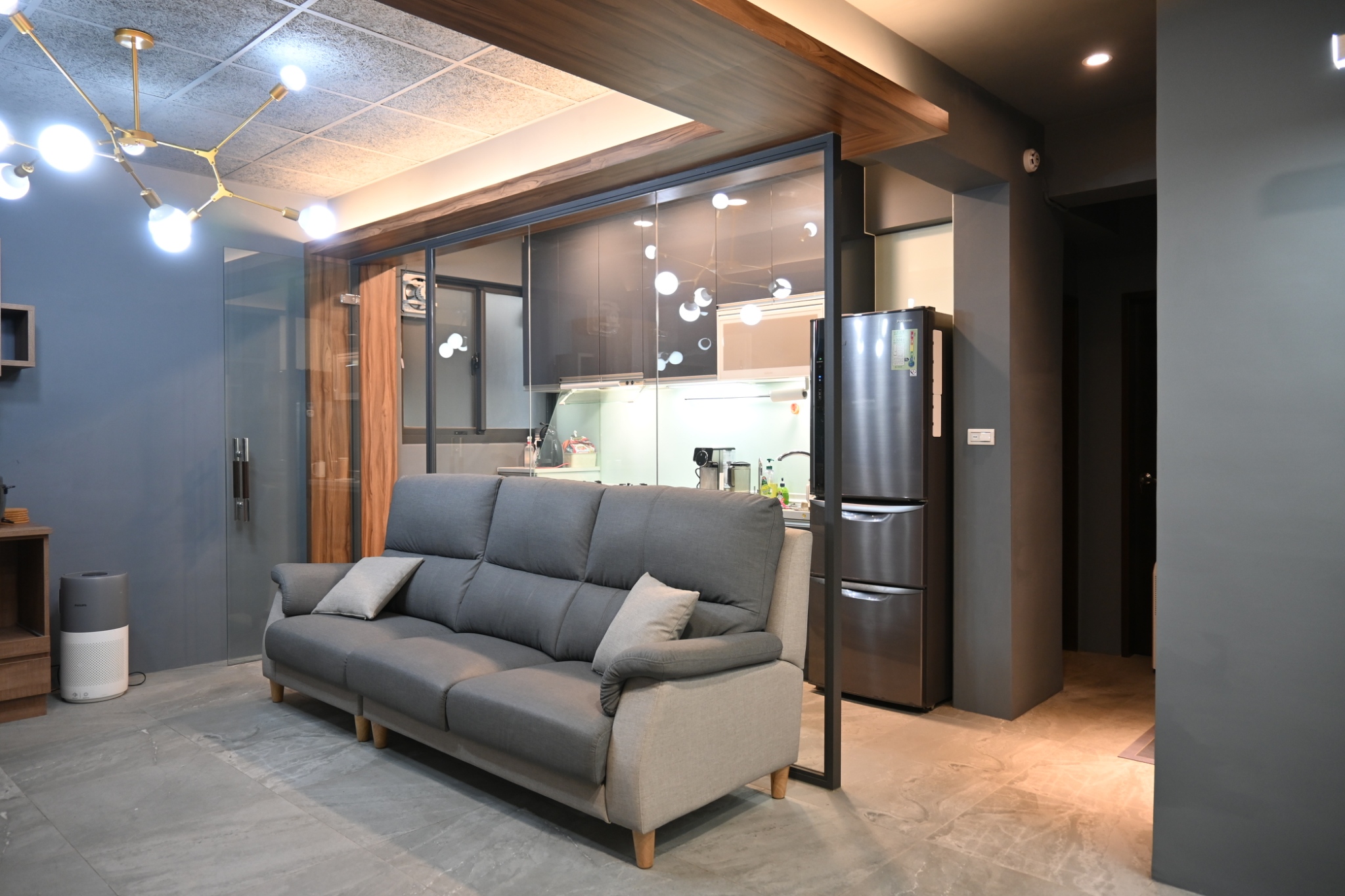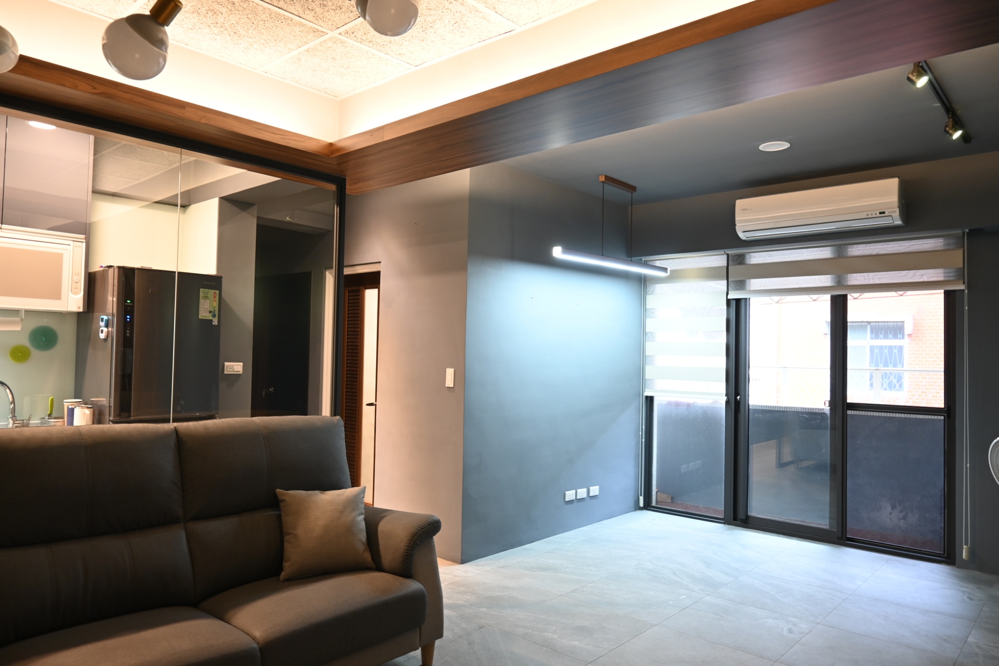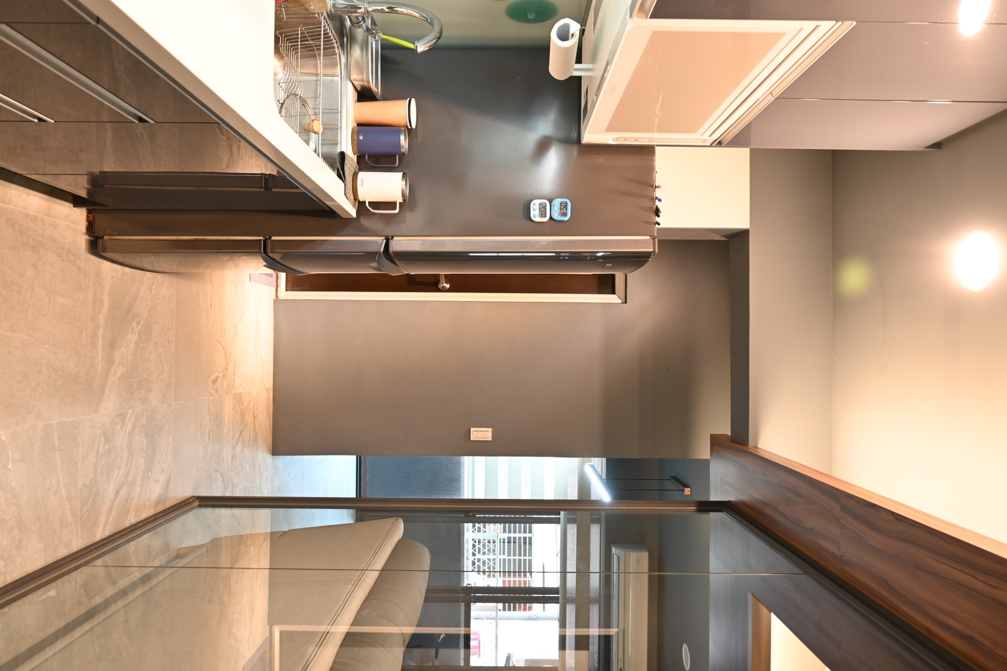 耐燃木作與強化玻璃門,隔油煙又擴空間,現代極簡風,房間溫暖柔和,櫃體頂天收納多,採光通透,新婚打造夢想家。
