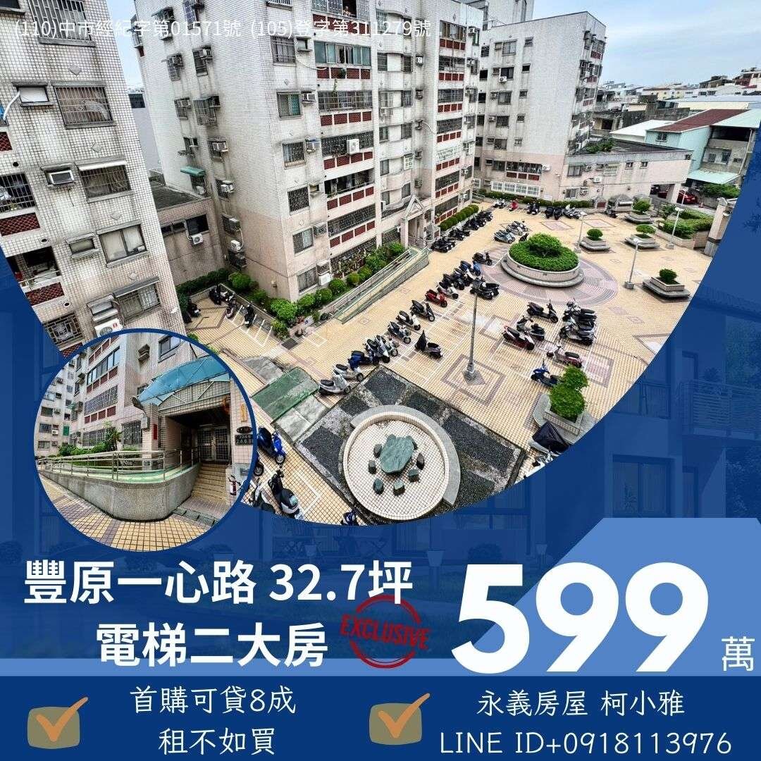 獨家專賣, 豐原一心名邸社區 低總價大二房,室內就有23坪大空間!! 總價只要598萬 豐原八方夜市,豐富計劃 首購族可貸七~八成。 低總價低負擔,在高租金的時代,租不如買! 幫房東付房貸,不如幫自己存一間房。 獨家好案,歡迎您的約看。 永義房屋 柯小雅 LINE ID+0918113976