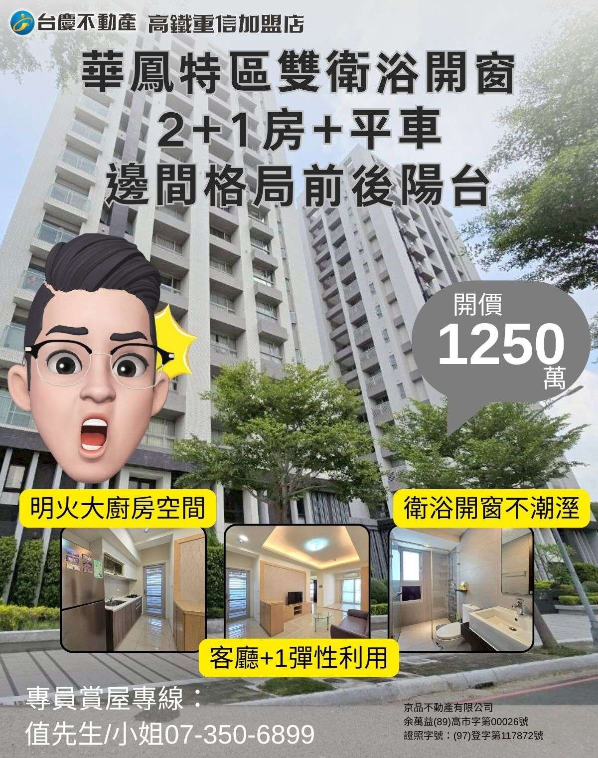 華鳳特區稀有雙衛浴開窗2+1房+平面車位 邊間格局三面採光,雙衛浴開窗通風不潮溼。 前面大陽台大棟距,後工作陽台陽光通風很可以。 鄰多座鎮北里公園綠地,社區寧靜不吵雜。 近文龍東路商圈串接文山特區商圈,直達澄清路。生活機能免煩惱。 近鳳山熱帶園藝試驗分所、澄清湖風景區、長庚紀念醫院,休閒與運動健康兼顧。 近台1省道、文龍東路、經武路、鳳松路,交通便捷。