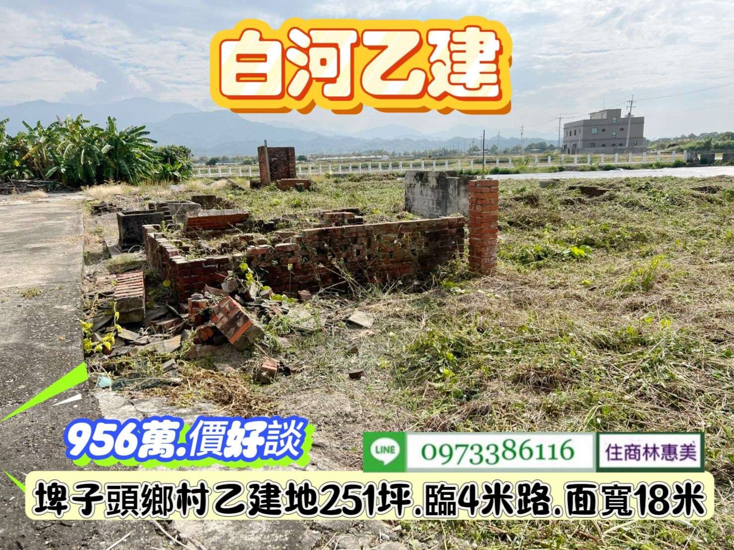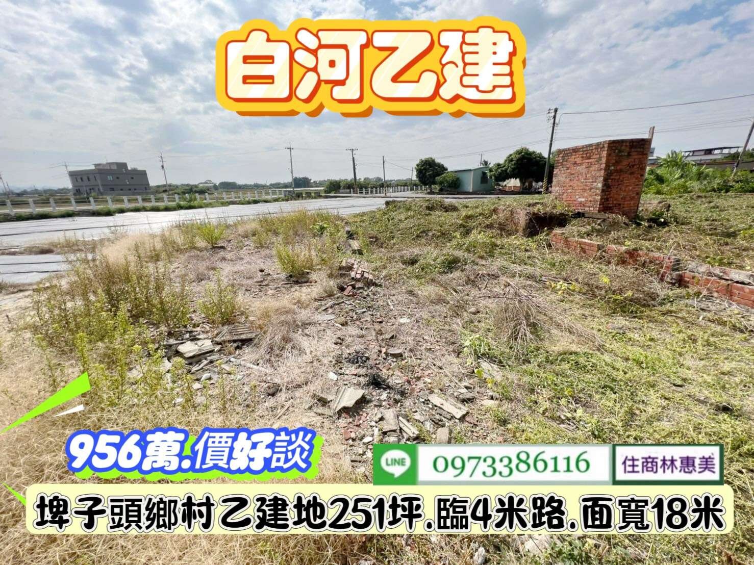 白河區埤子頭18米大面寬251坪建地/售956萬.價可談/林惠美0973386116