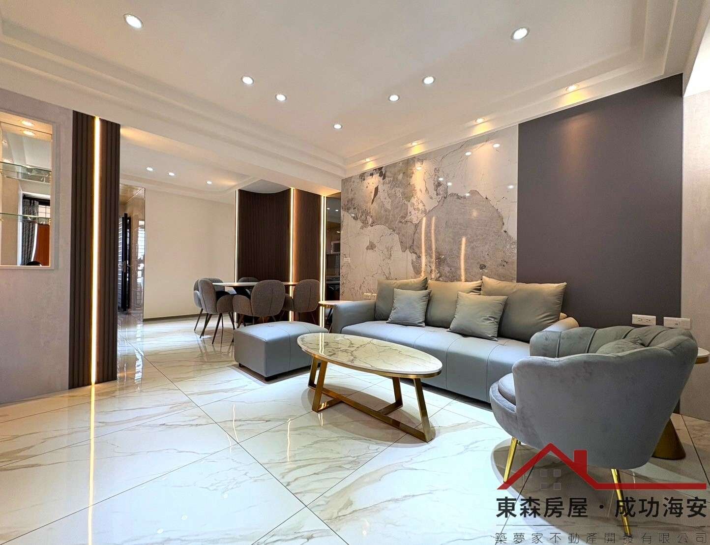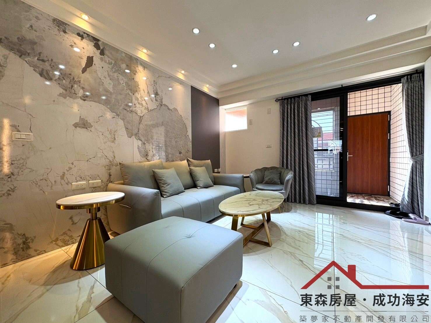 光,從落地窗灑進客廳,映著石紋牆面與柔灰沙發的細膩質感。