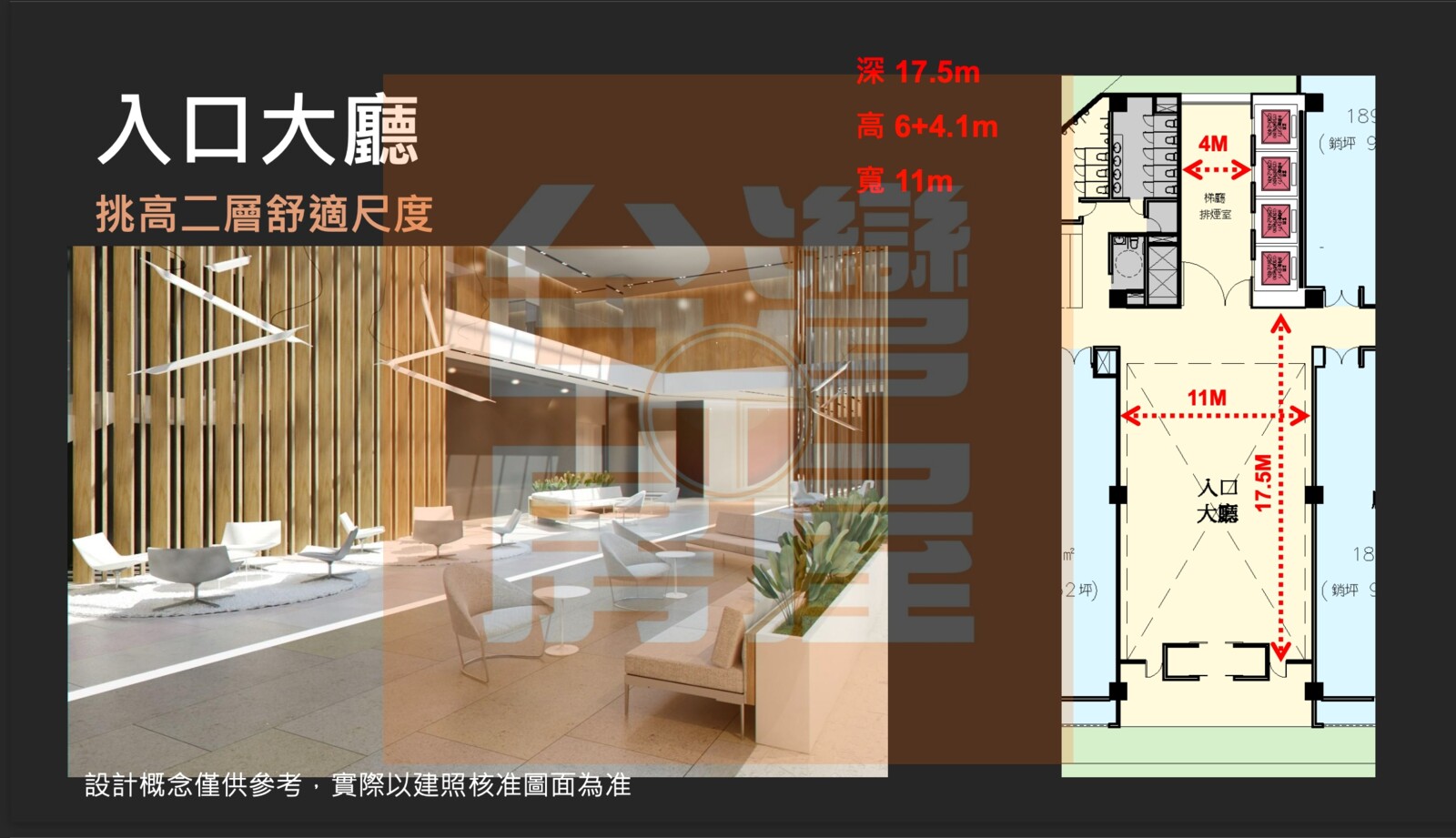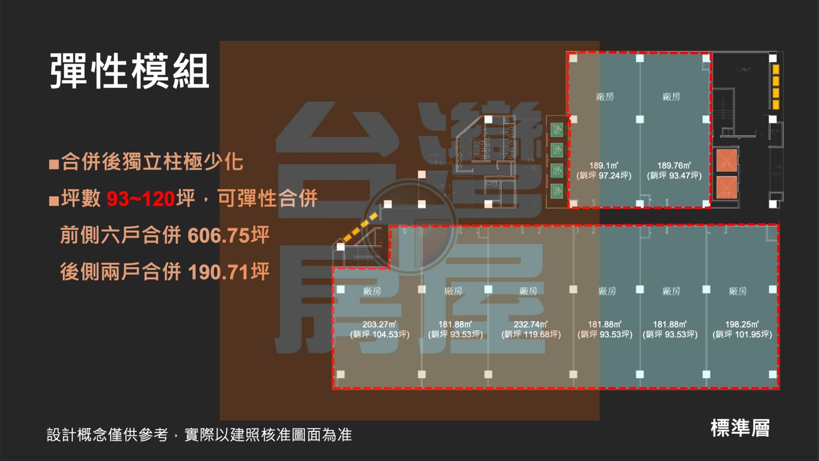 單戶柱位跨距最大11M 合併戶最大面寬可達55米