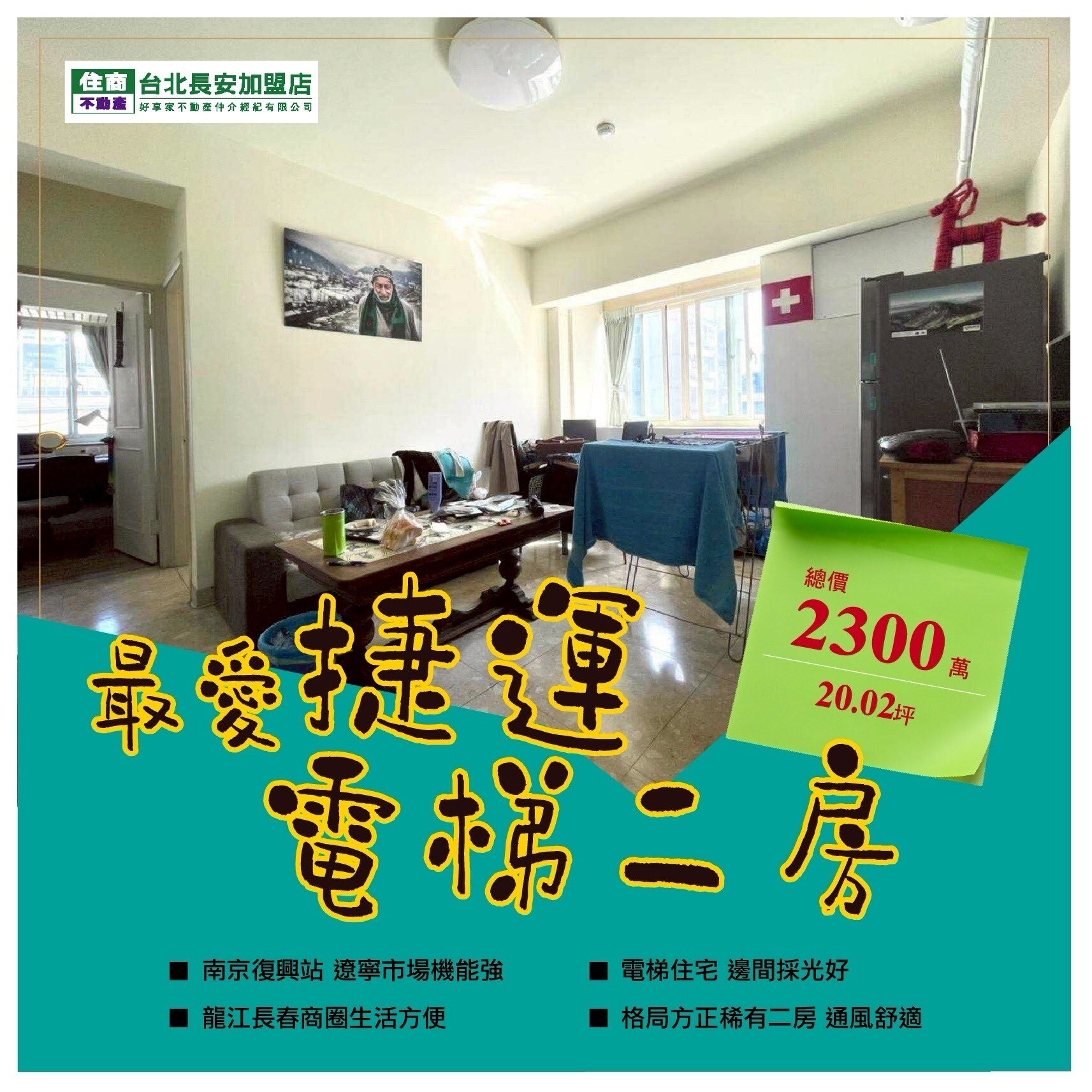 物件特色: 南京復興站 遼寧市場機能強,龍江長春商圈生活方便,電梯住宅 邊間採光好,格局方正稀有二房 通風舒適 住商台北長安店 陳政宏0987-173-408 好享家不動產仲介經紀有限公司 (89)苗縣地登字第00022號 徐振麒 每成交一筆會捐1%作爲公益