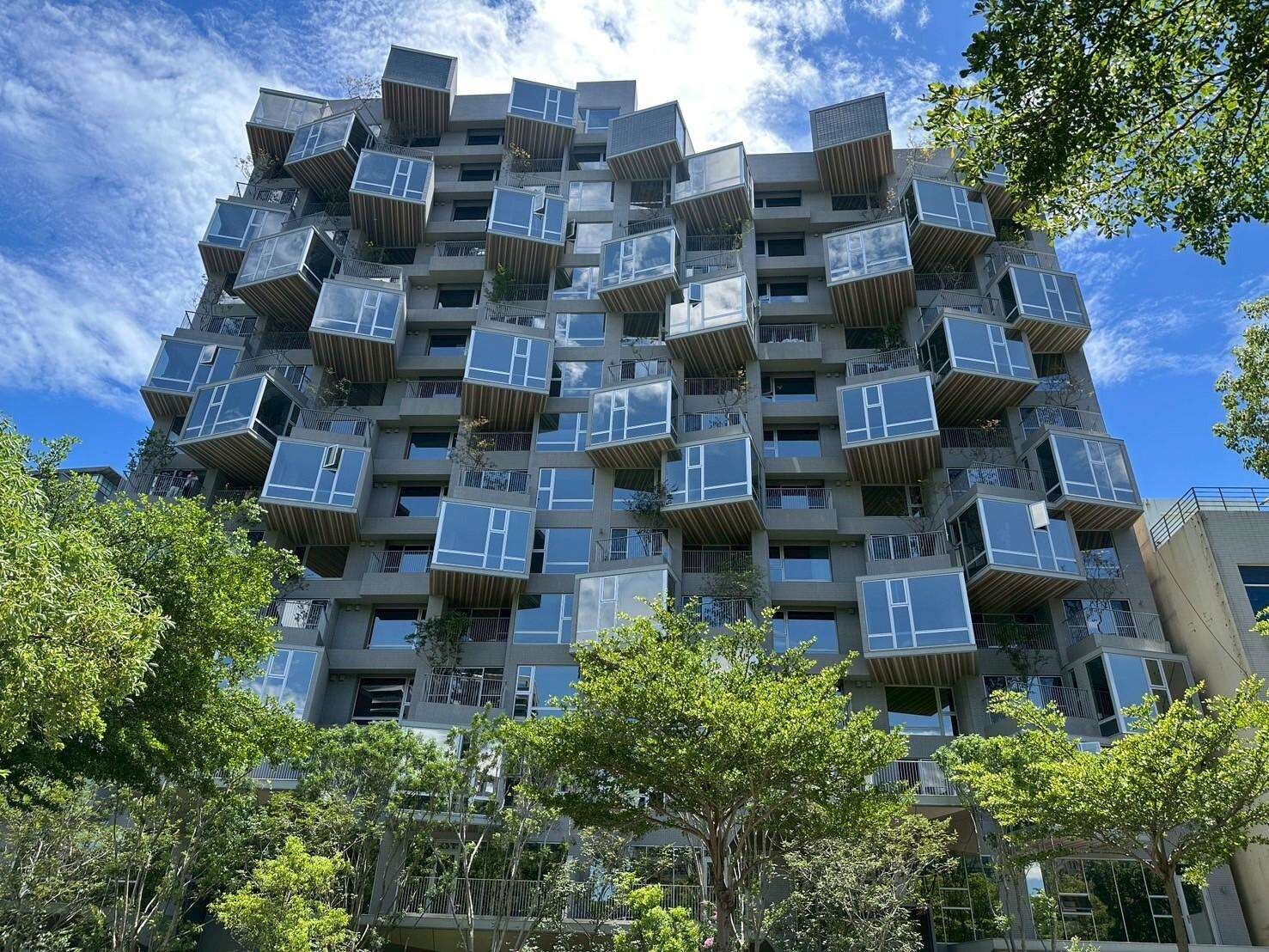獨特外觀設計: 建築外觀採用獨特的設計,將每戶設計成獨立的「生活盒子」,並以15度微旋轉的斜角玻璃屋,讓每一戶的開口面向不同,創造出獨特的視覺效果。 面公園: 位於竹北市嘉豐九路,正對水圳公園,享有開闊的視野和綠意。 大陽台: 每戶配有大陽台,提供寬闊的戶外空間。 獨特的梯廳設計: 每一層的梯廳都使用特殊的磚塊裝飾,增加建築的獨特性。 結構安全: 建築結構經過精心設計,確保在台灣極限的地震和颱風環境下具有足夠的安全性。