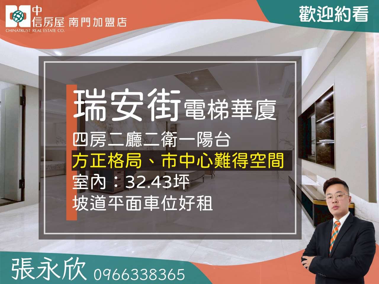 🏡物件:大面採光明亮,全新精裝電梯華廈,大四房雙衛,可另租坡道平面車位(2940元/月)。