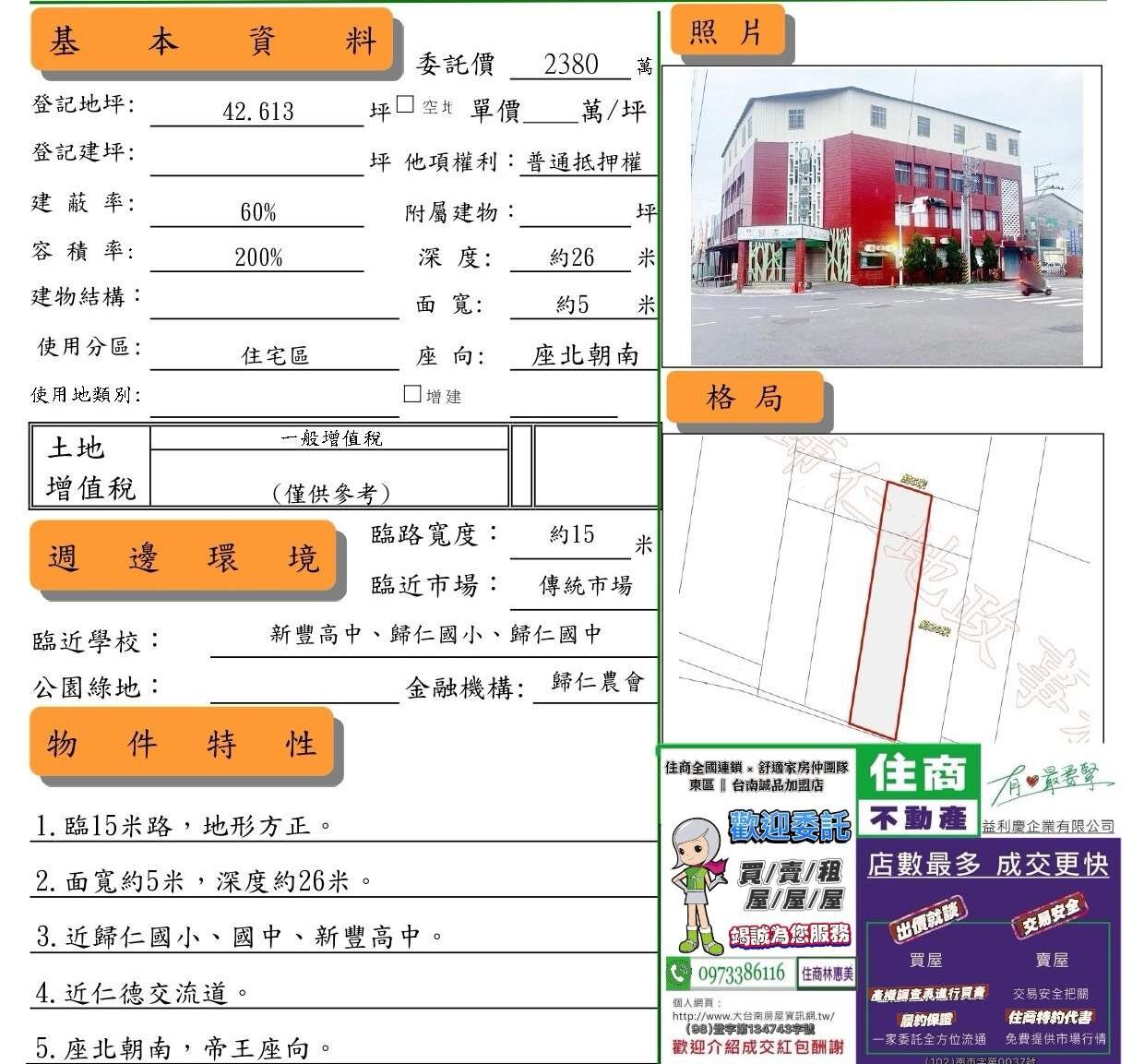 歸仁區歸仁農會臨15米路朝南店面建地/售2180萬價可談/林惠美0973386116