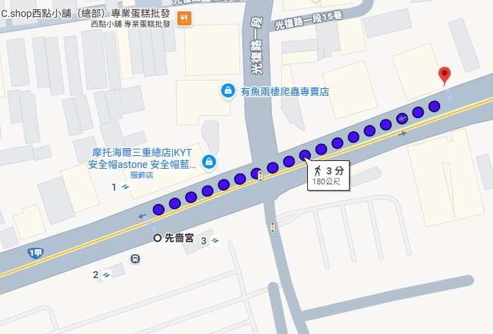 谷歌地圖顯示走路到先嗇宮捷運只需180公尺,大約3分鐘