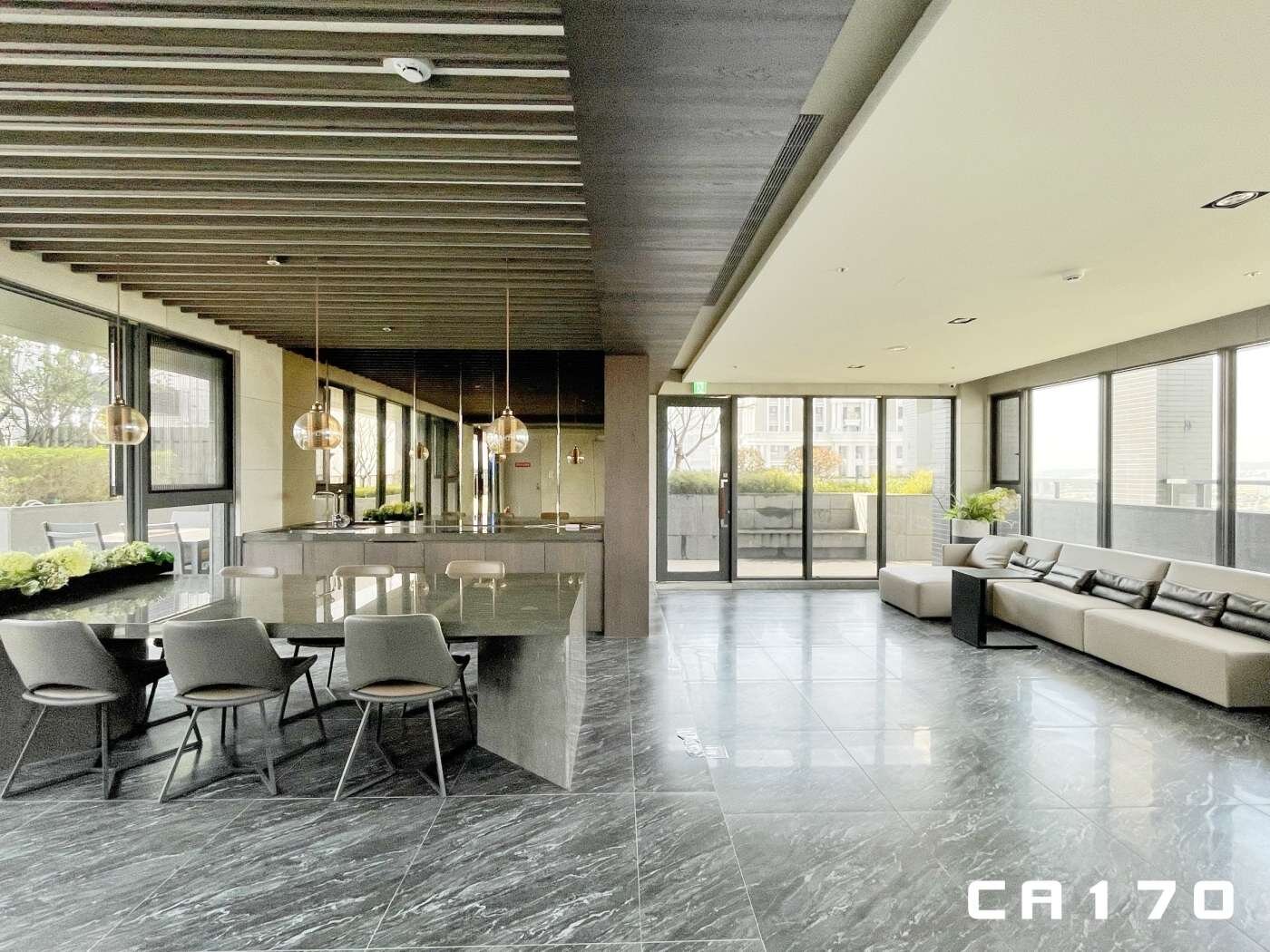 1樓大廳挑高8.8米,公設有咖啡吧台、運動吧、閱覽室、水景牆,2樓有露天泳池、健身房,