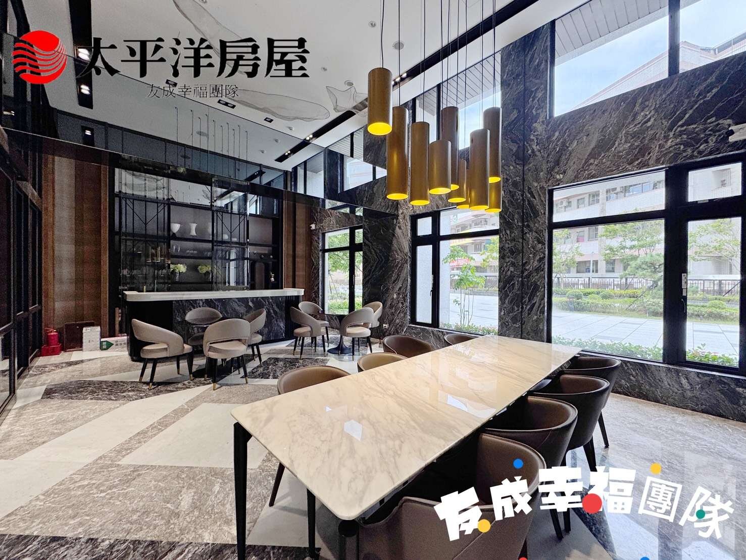 一樓挑高 6 米,基座採石材包覆,展現大器門面
