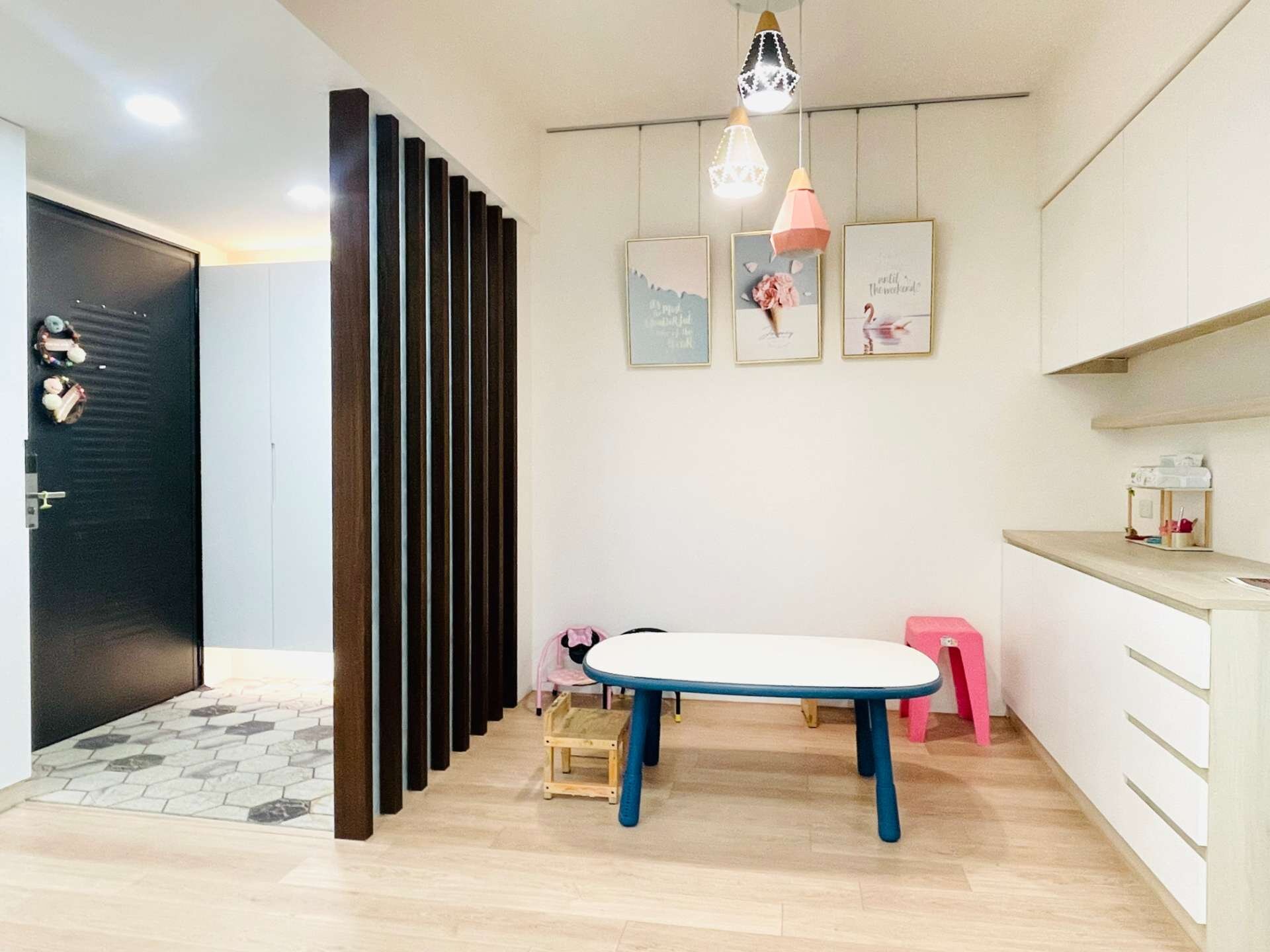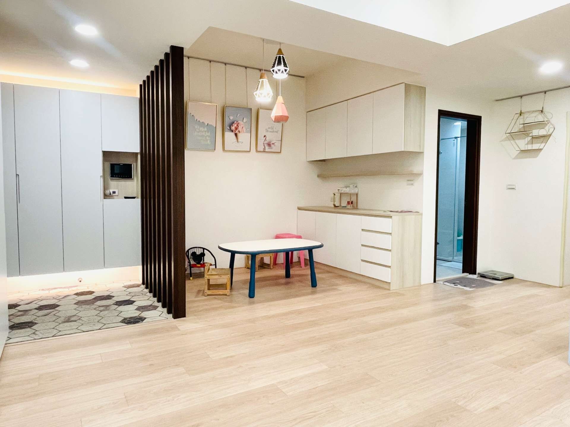 ★地板抛光石英磚、屋主加舖設卜耐磨、防滑、防水、卡扣式木質地板