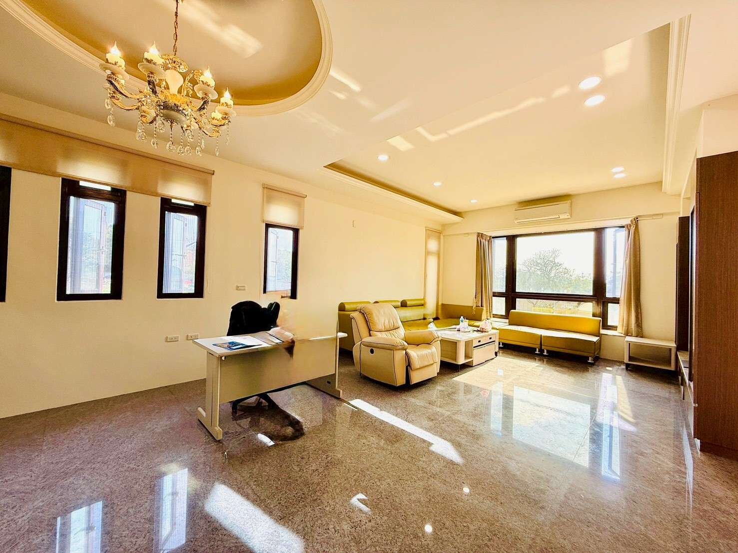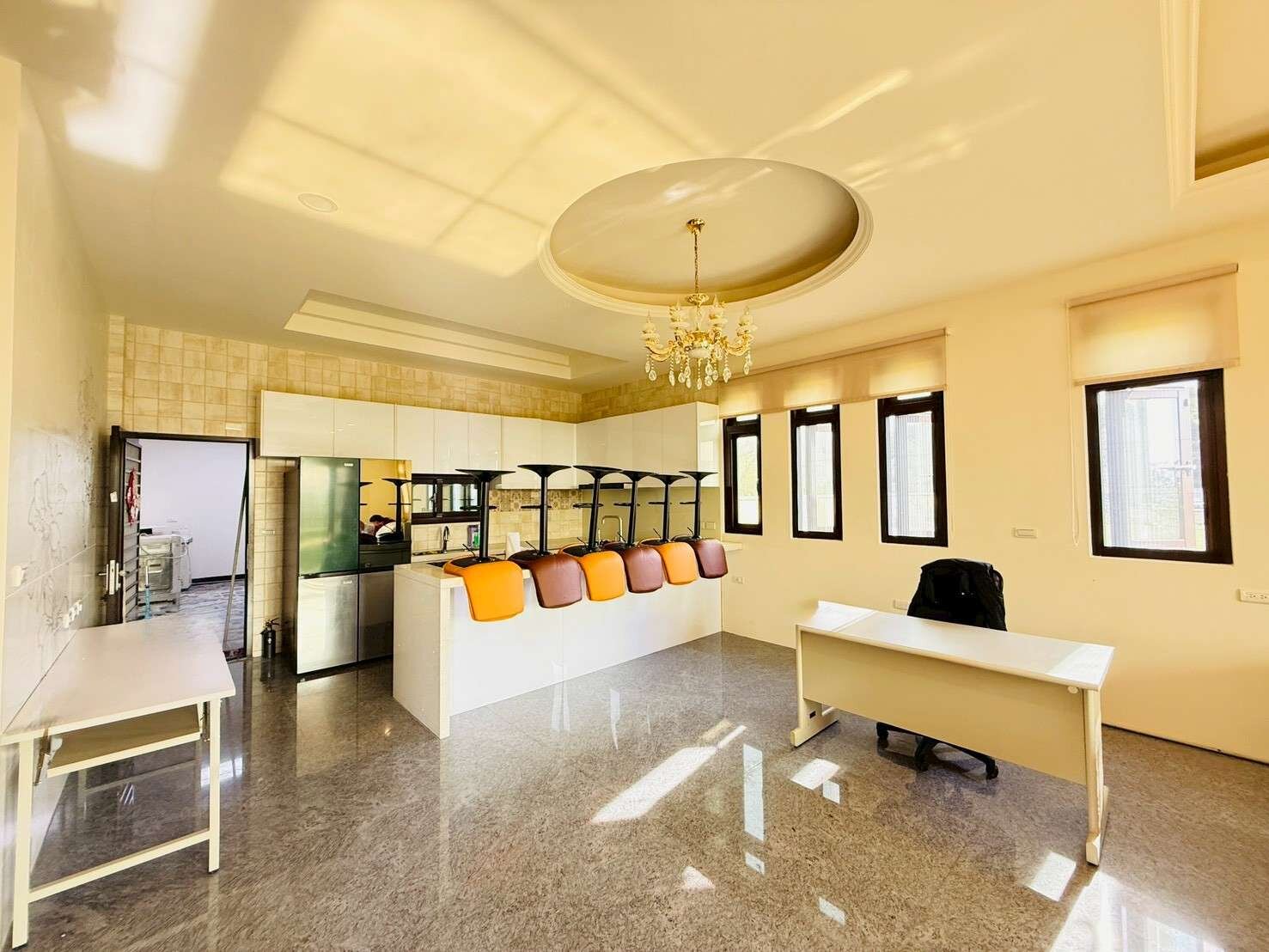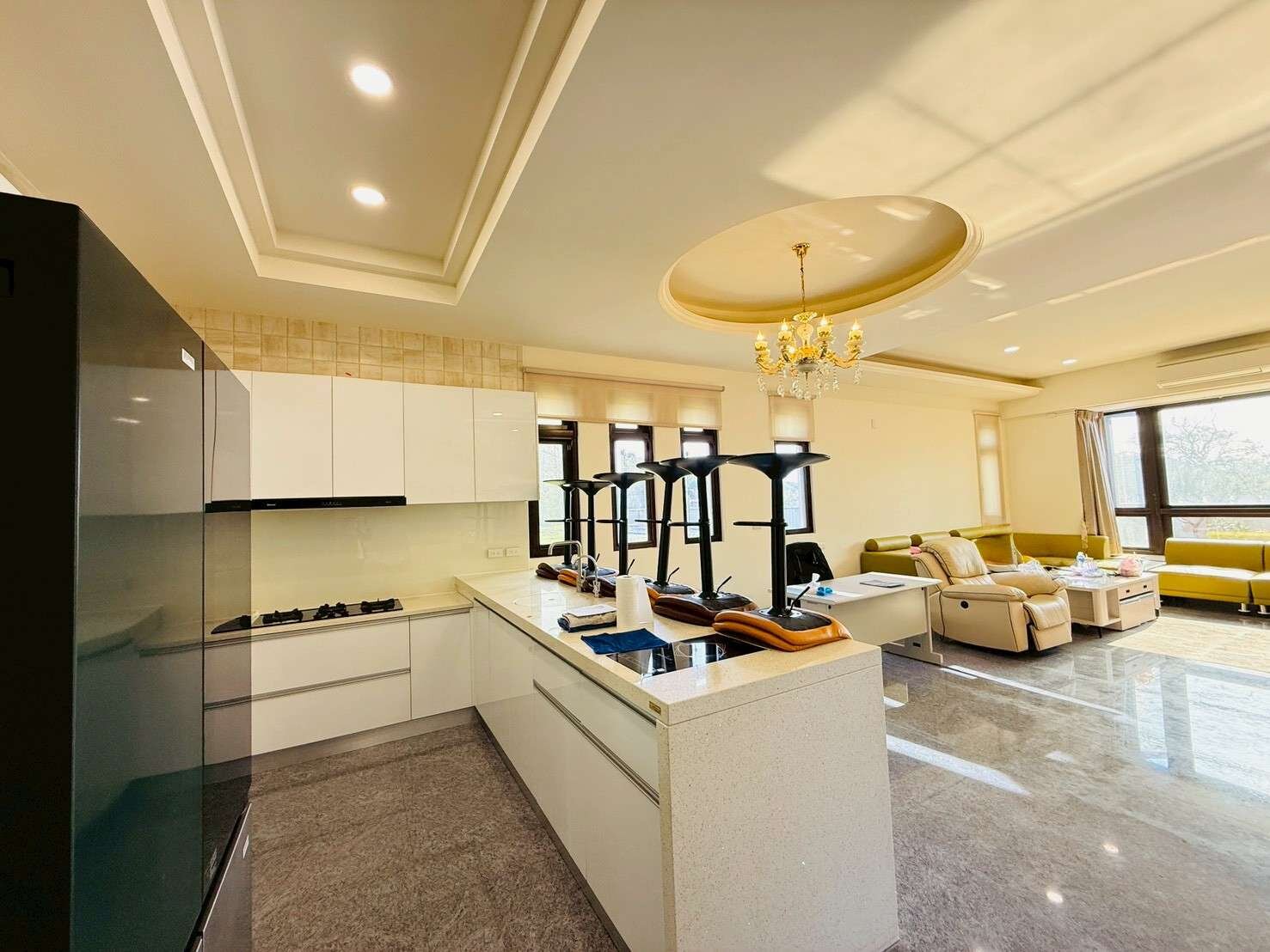 現代空間: 室內 77 坪規劃完善,寬敞客廳搭配奢華水晶燈飾,開放式中島廚房與大理石地坪,打造賓客盡歡的社交場域。