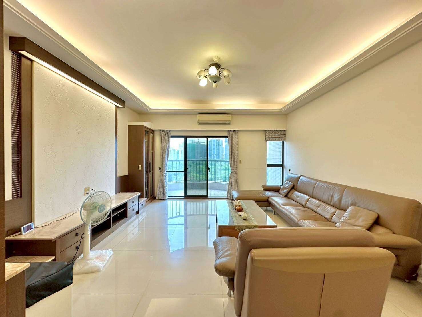 氣派客廳: 寬敞的客廳設計,在與家人同聚時,整片愛河水色就是最美的背景。