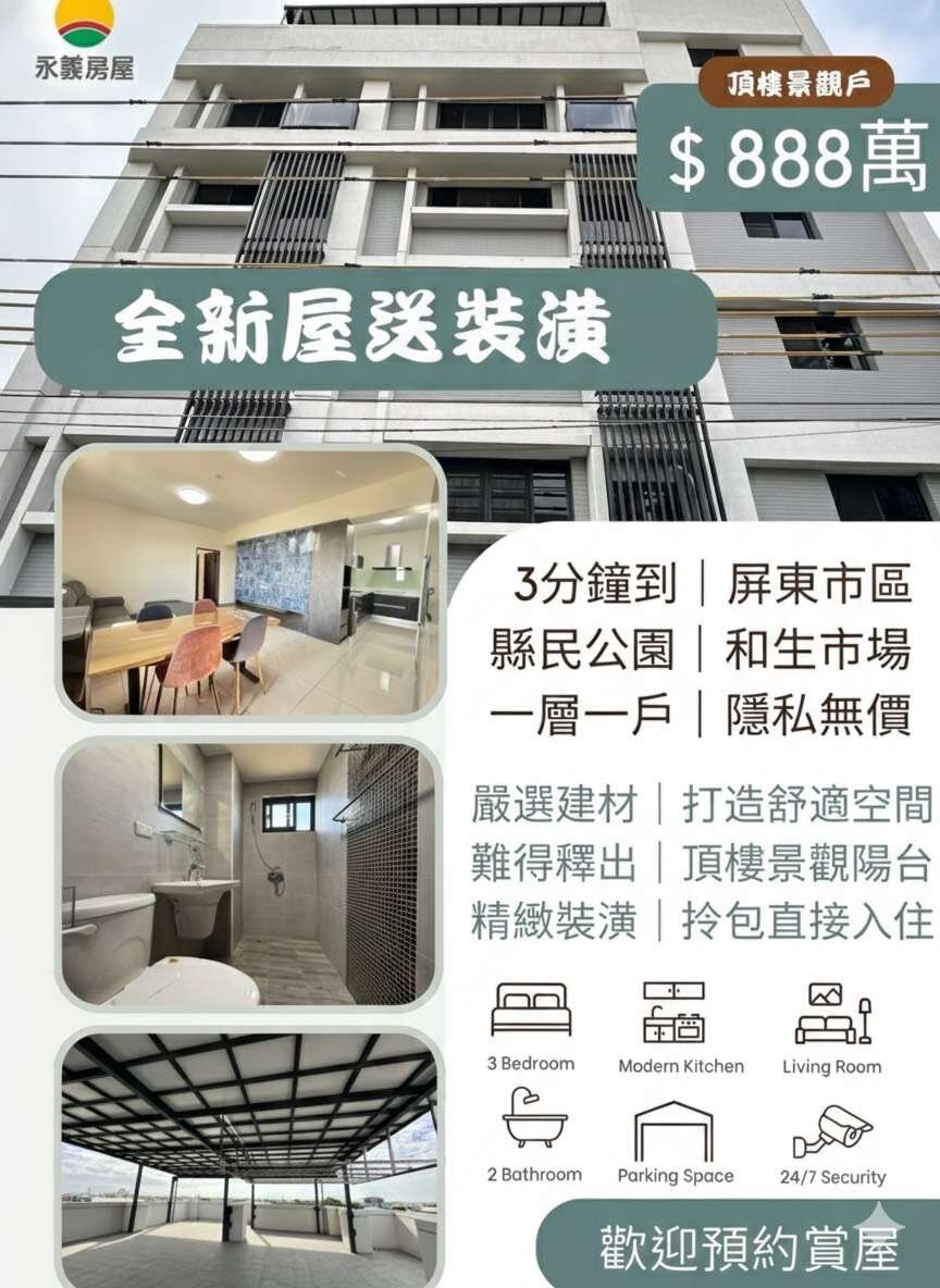 縣民公園❣️全新買房送裝潢❣️景觀戶三房平車