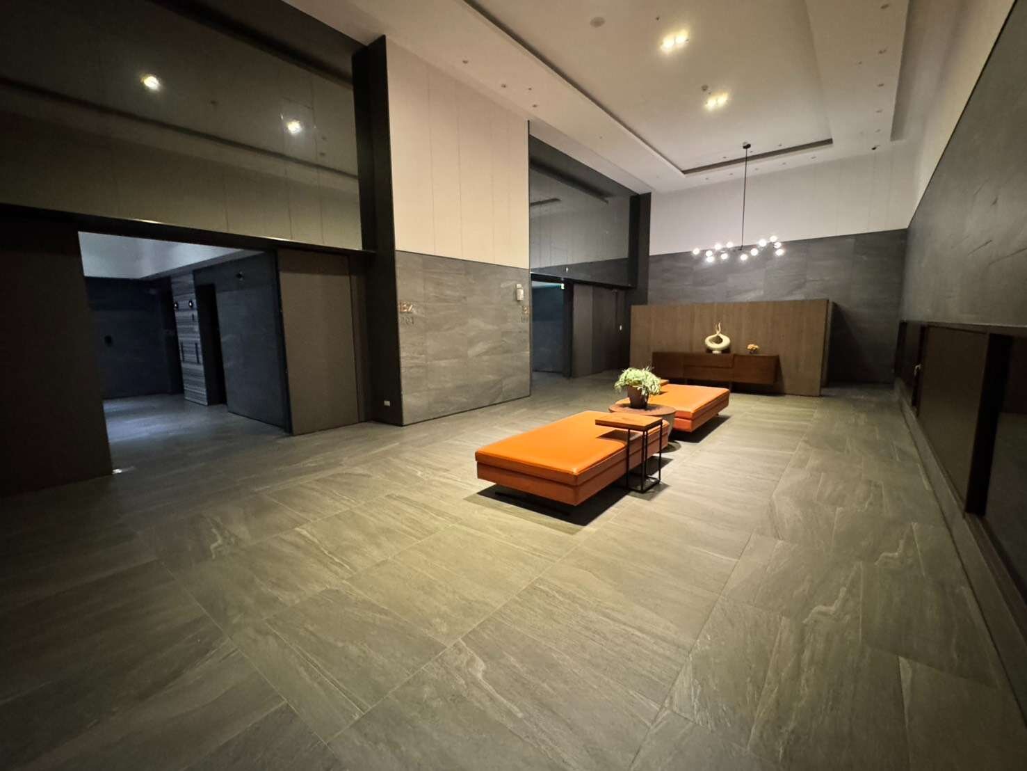 👉社區一樓門廳,結合天花板挑高、藝術廊道、造型燈飾設計,彰顯空間獨特人文藝術氛圍。