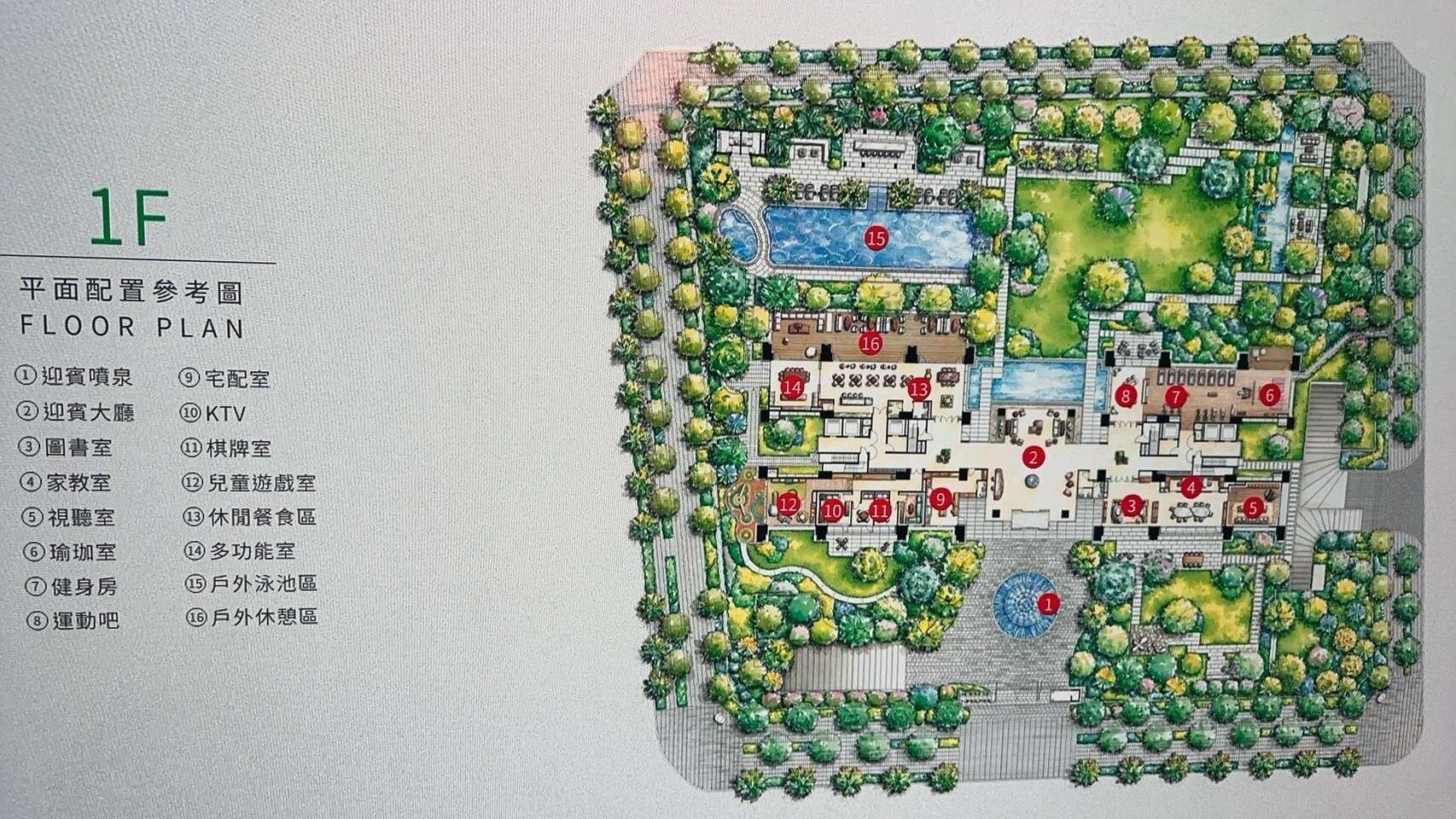 迎賓車道、6米挑高大廳、戶外泳池、健身房、瑜珈室、KTV、視聽室、閱覽室、遊戲室、多功能室、家教室等