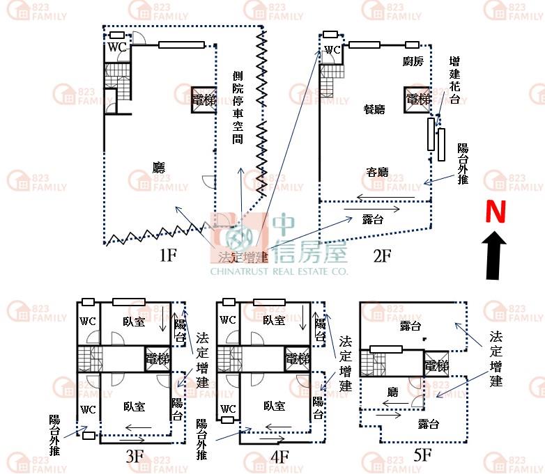 3.自有車庫可停四車.二樓餐廳有側院前院.三.四樓四套房.六間衛浴皆開窗.五樓露臺陽台