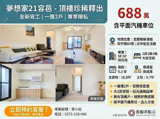 #宜蘭房地產 #蘇澳買屋 #夢想家21容邑 #新成屋 #頂樓戶 #低總價大2房 #專業房仲黎小姐 #永慶不動產羅東環鎮加盟店(驊騮不動產)