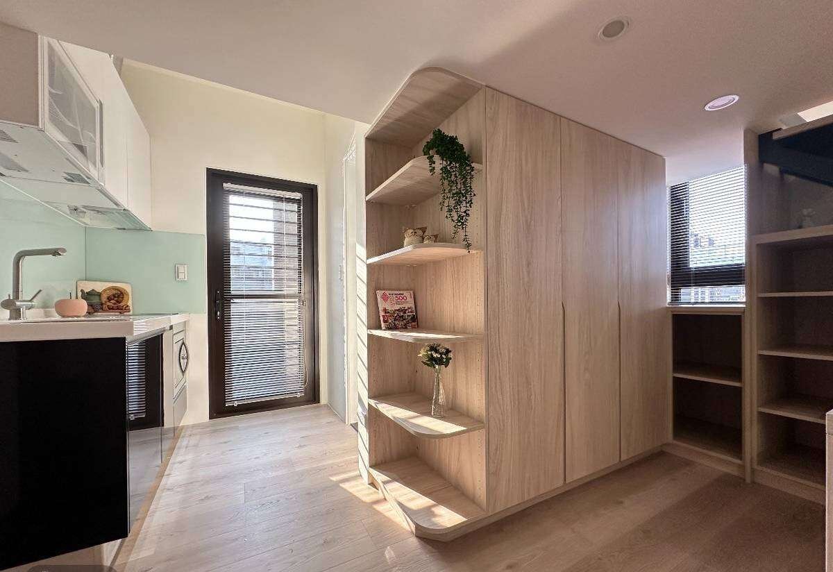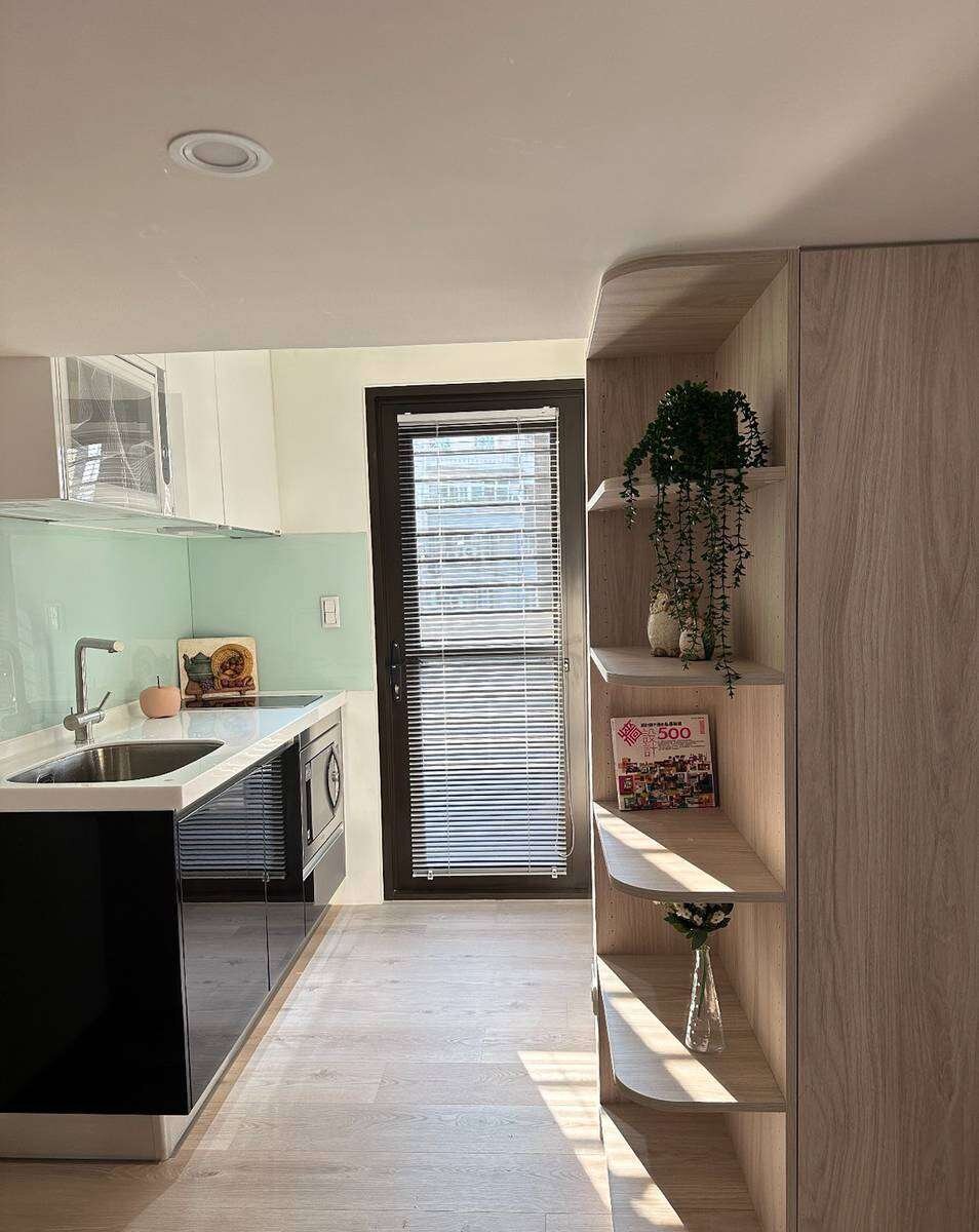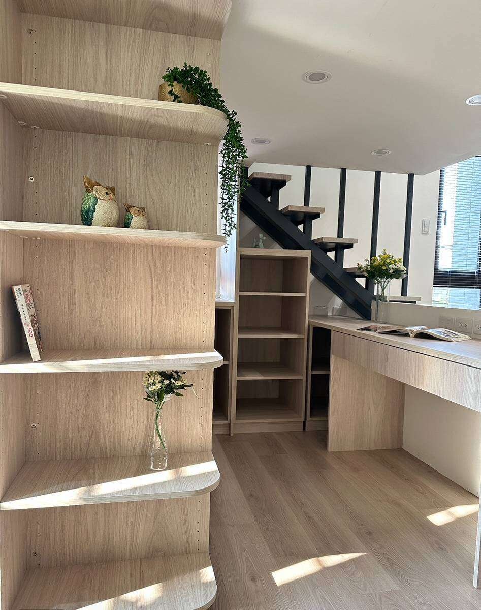 「右成素也」最迷人的就是室內挑高 3.6 米的規劃。即使是 19 坪左右的小豪宅,透過垂直空間的運用,完全沒有壓迫感,魔術空間讓收納跟機能都翻倍,對於質感單身族或新婚夫妻來說,真的是神好用。