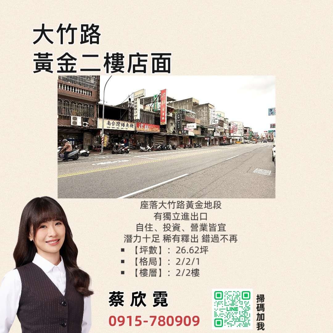 大竹路黃金二樓店面 坐落精華大竹路 有獨立進出口 商家林立 自住、投資、營業皆宜 潛力十足 稀有釋出 錯過不在 【聯絡方式】: 蔡小姐 歡迎賞屋加ʟɪɴᴇ或來電 📞0915-780909 ʟɪɴᴇ ɪᴅ: @741dcnix https://lin.ee/aPN2NpY 【經紀業】:永慶大竹加盟店-阡群不動產開發有限公司 →(103)桃縣字第001460號劉怡珊