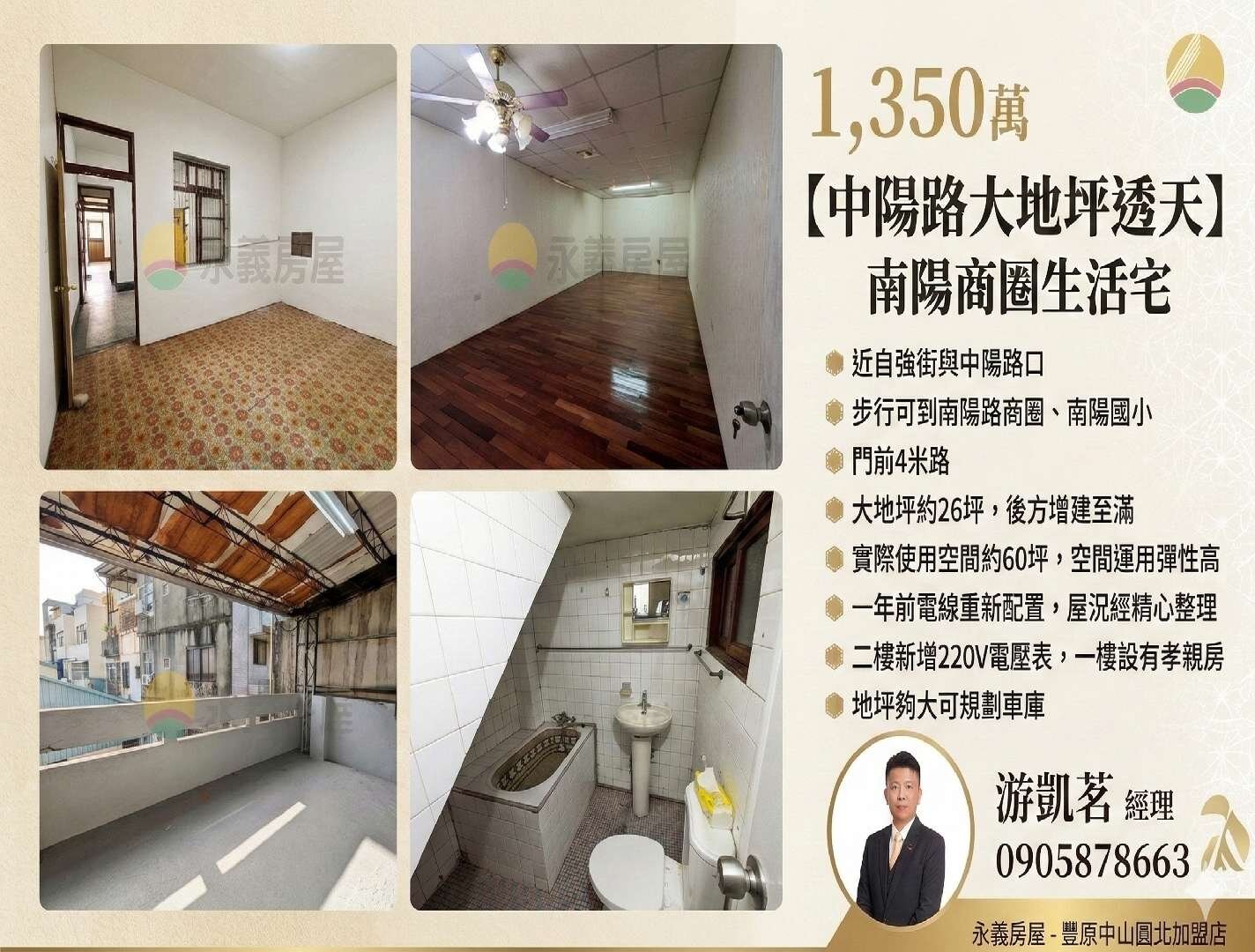 ▪ 近自強街與中陽路路口 ▪ 步行可到南陽路商圈、南陽國小 ▪ 門前4米路 ▪ 大地坪透天,地坪約26坪 後方增建至滿 實際使用空間約60坪 一年前電線重新配置 室內重新油漆整理 二樓新增220V電壓表 屋況需整理 地坪夠大可規劃車庫 一樓設有孝親房 空間運用彈性高