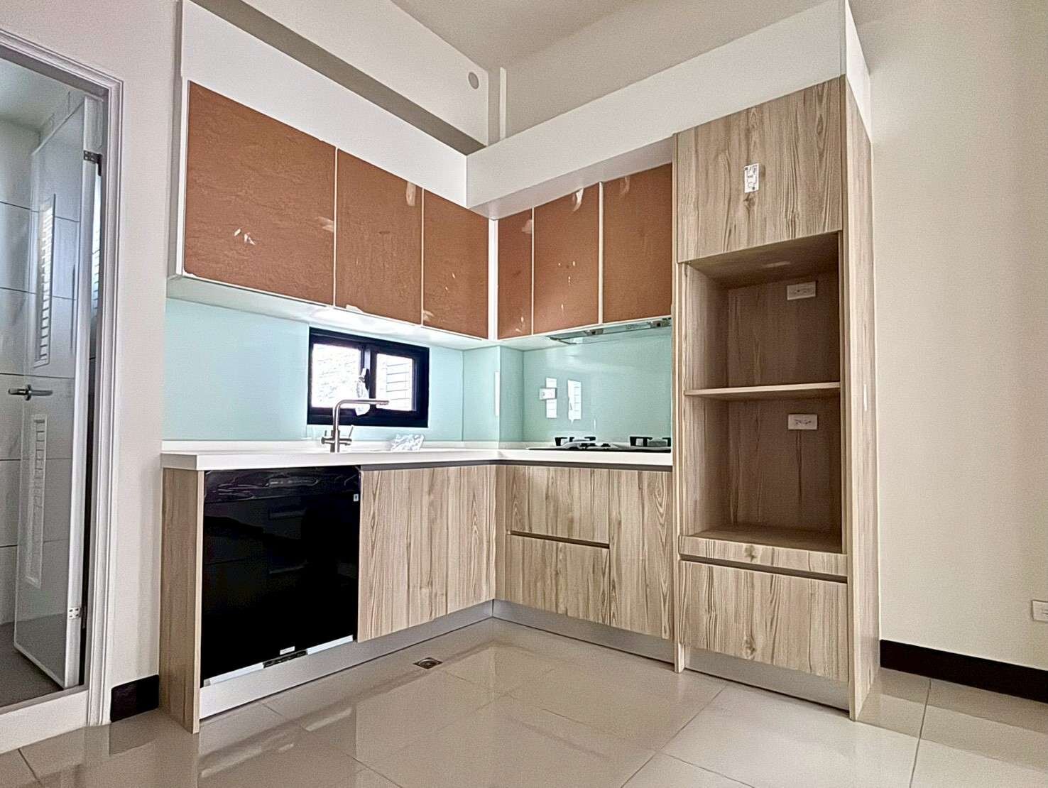•隱藏式抽油煙機、雙口強化玻璃瓦斯爐、落地烘碗機
