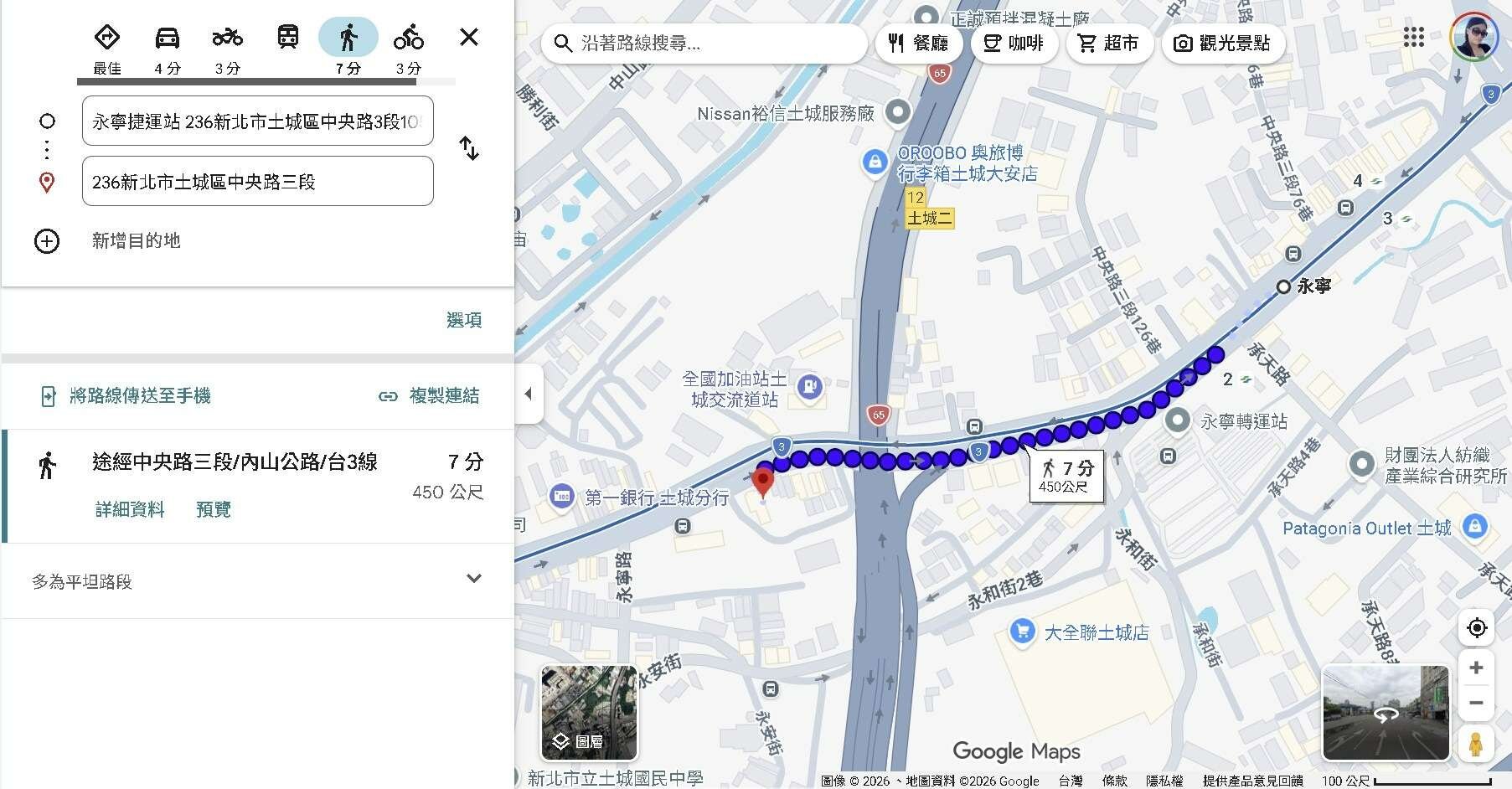 📌Google顯示步行至永寧捷運站約450公尺7分鐘