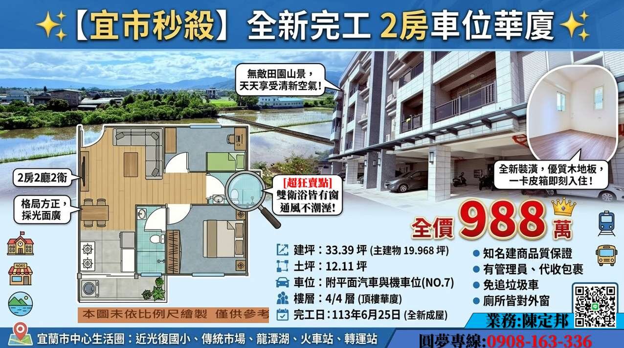 ✅ 交通便利: 近國道五號、宜蘭市中心、龍潭商圈,生活機能一應俱全。 ✅ 專屬車位: 附贈平面大車位與專屬機車位,愛車免吹風淋雨。