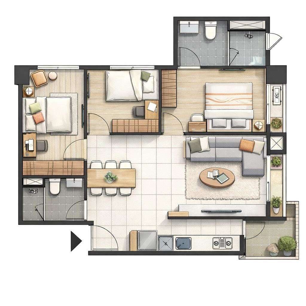 📐格局|三房二廳二衛室內含陽台約 22 坪,臥室間間開窗,採光與通風條件穩定。