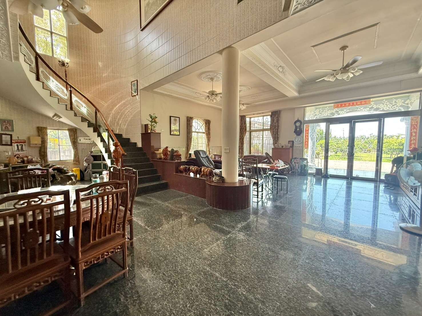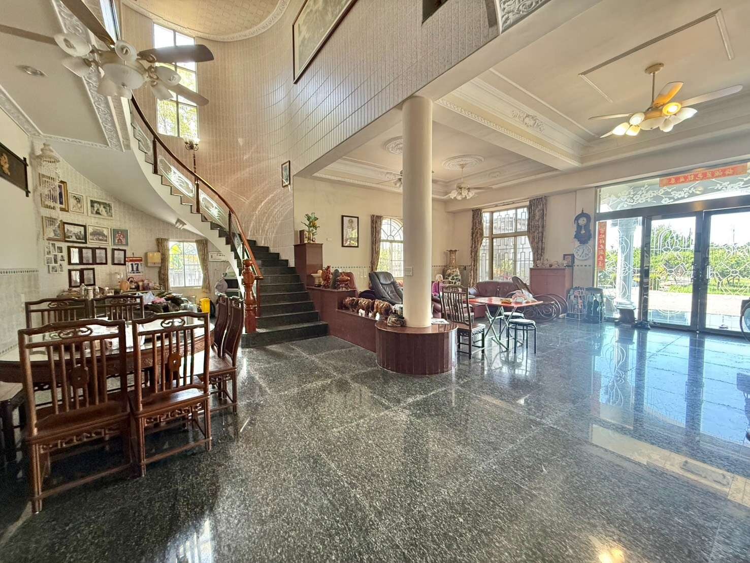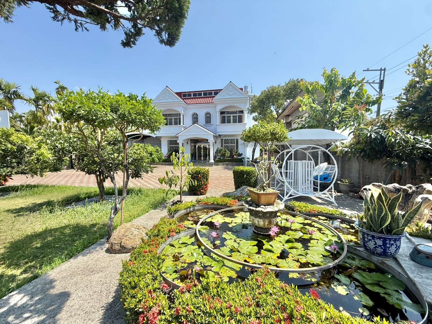 ● 下國道3號南州交流道,南州蛋塔往新埤方向,開車約8分鐘就到本豪邸莊園。交通便捷。 ● 本莊園附近500公尺內無豬舍鴨舍雞舍,全部都是乾淨的農地,沿途盡是漂亮的農舍住家,環境非常乾淨,空氣清新,地勢平坦排水良好不淹水。 ● 兩邊臨路的都內農地591坪,大門口處是約5米的活路,車輛進出迴轉都OK,莊園的電動車庫門,高度約3.5米,遊覽車也進得來。 ● 庭園種植觀賞用的高價值松柏、偃柏、福木、還有魚池觀景台、籃球場,屋主自住,每天都用心栽培,保養庭園,怡然自得。有緣購買者,可全部相贈。 ● 地上屋主親自監工,蓋有一棟有合法產權登記,權狀建坪共106.872坪的二樓農舍別墅。建築結構因應自住安全特別強化。旁邊另有鐵皮屋搭建的車庫,莊園土地四周有約1.8米高的堅實圍牆,打造安全莊園。 ● 目前有挖井,使用地下水。自來水管路有經過本莊園門口,有需要的話可以直接接管申請本屋使用。 ● 房屋精心設計外觀宛如白宮,莊園處處乾淨禪風靜謐,真心推薦給您這間稀有漂亮價格平實的好物件。
