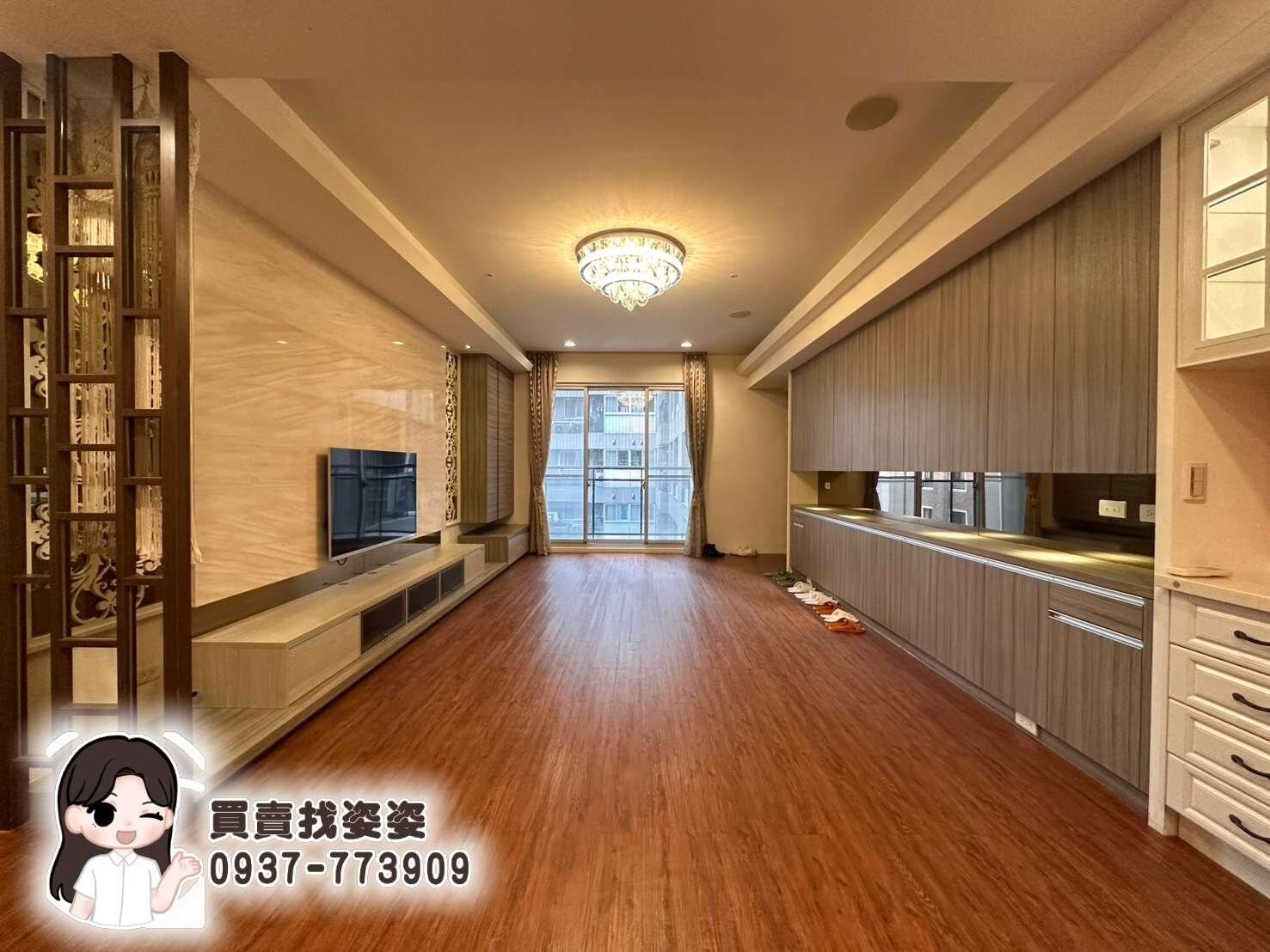 豪宅規格: 客廳大面寬展現大器氛圍,電視牆採用石材拼接工藝,搭配細膩雕花與水晶燈,彰顯不凡品味。