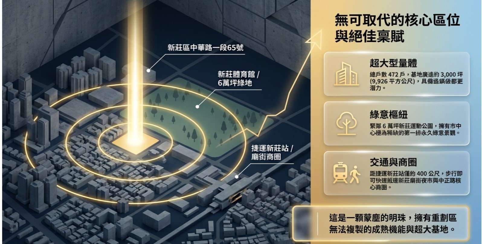 市中心的絕對地位:相較於副都心或頭前重劃區需要時間發展且推案量大,「名人天廈」位處新莊發展最成熟的正核心 這塊基地可以說集結了「景觀、捷運、商圈、大基地改建」四大房產不敗定律 臨近體育館公園、新莊棒球場,黃昏市場、新莊捷運站