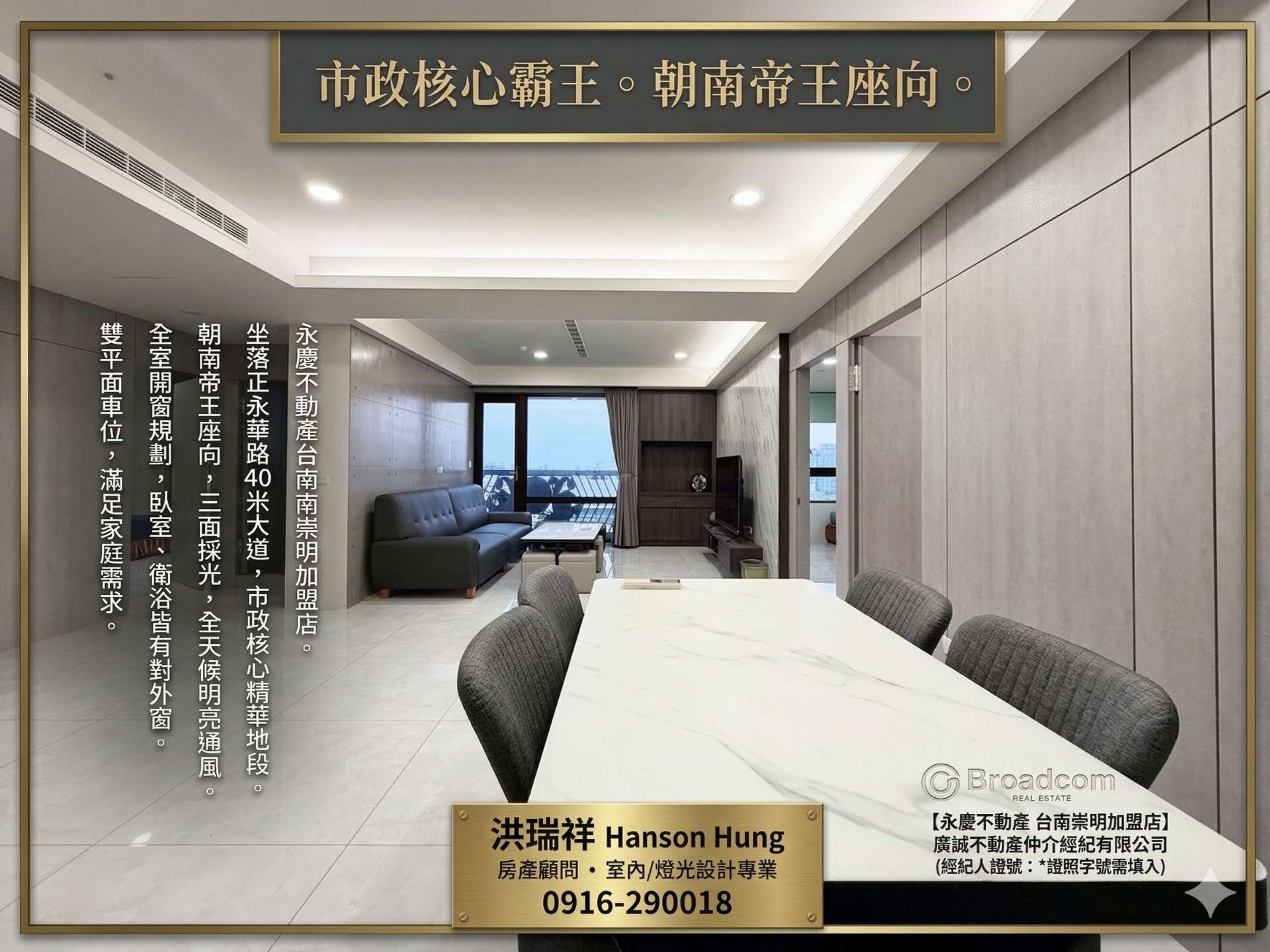 1.坐落正永華路40米大道,市政核心精華地段 2.朝南帝王座向│三面採光,全天候明亮通風,盡享開闊市景 3.全室開窗規劃│臥室、衛浴皆有對外窗,採光通風 4.雙平面車位│停車便利,滿足家庭雙車需求 5.成熟生活圈│正永華核心商圈,機能完善,生活一步到位