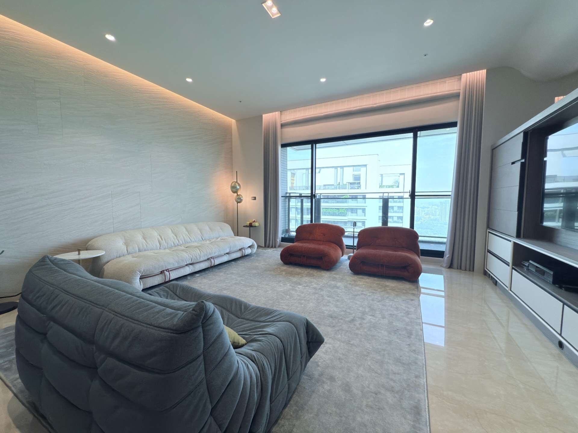 緊鄰綠園道,客廳大面落地窗結合透空玻璃圍欄,室內即享開闊景觀。