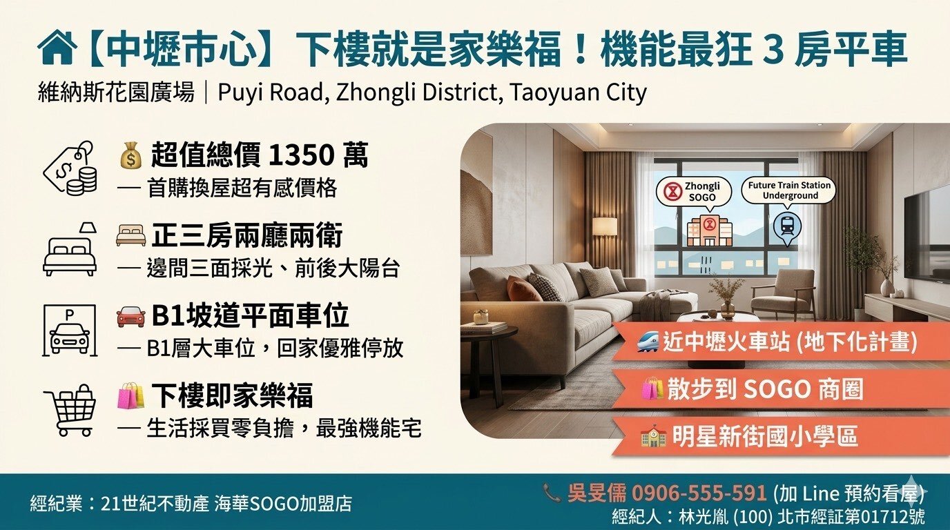 【車站家樂福旁】維納斯花園精裝 3 房|B1 坡道平面車位